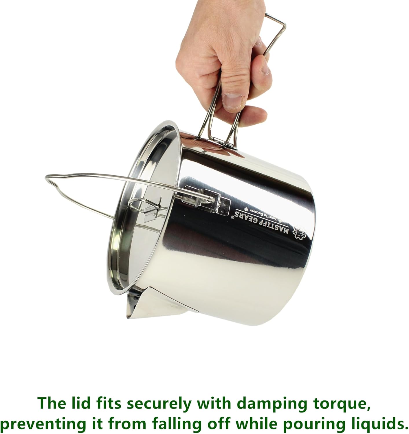 🐶 Food-Grade 304 (18/8) Stainless Steel: Durable & SafeCrafted from food-safe 304 (18/8) stainless steel, it’s durable for outdoor use. The mirror-finish exterior resists stains/carbon black for easy cleanup. 3-rivet handle ensures a secure grip; hanging handle has a locking mechanism for stability over fires. Tight-fitting lid prevents spills, and the “D” Ring lid handle cools quickly for safe use.