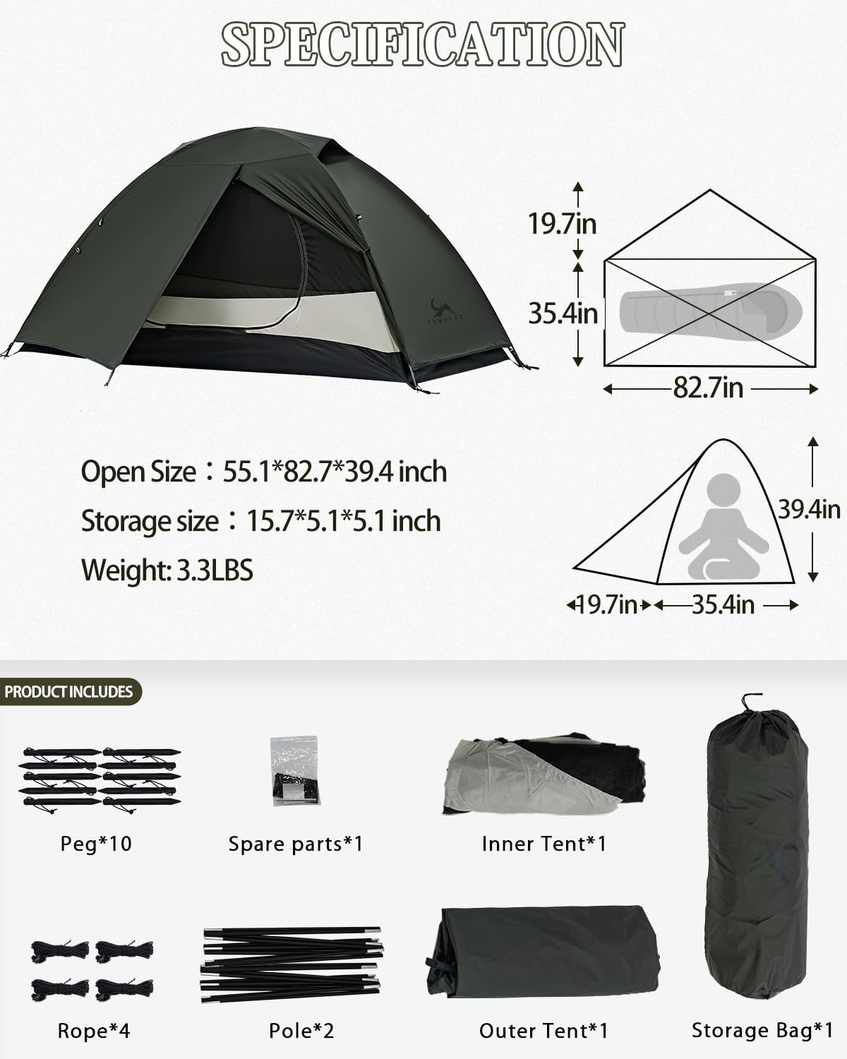 1-person: Inner tent: 88.6”*39.4”*44.1”; External tent: 92.5”*(23.6”+39.4”)*45.3”. weighs about 4.6lbs. Compact package size: 17.7”*5.9”.