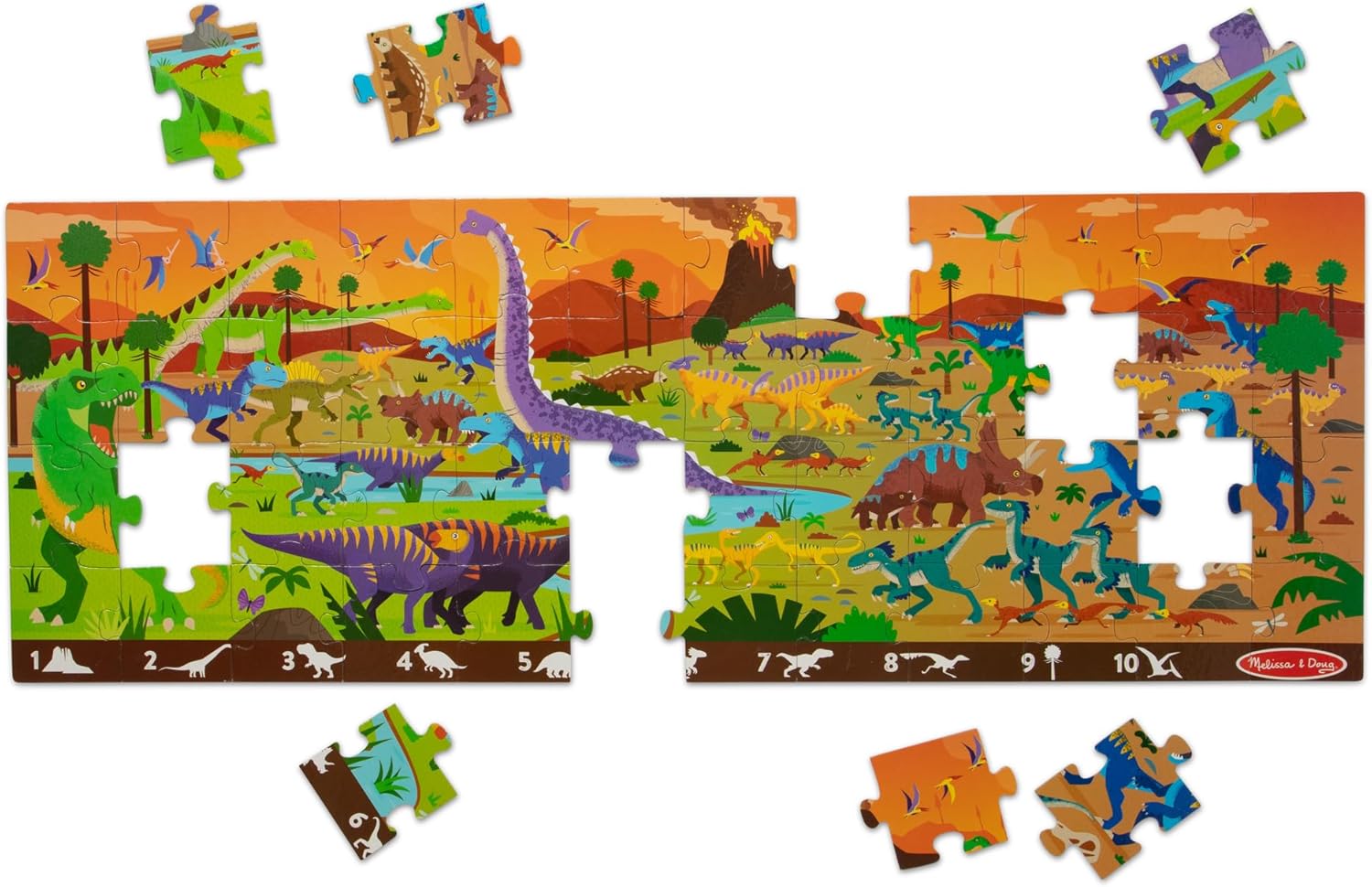 Explore a Dino-Filled World: Kids piece together 48 jumbo puzzle pieces to create a 4 ft prehistoric landscape, then scan the scene to find and count dinosaurs using the search and find prompts along the bottom border