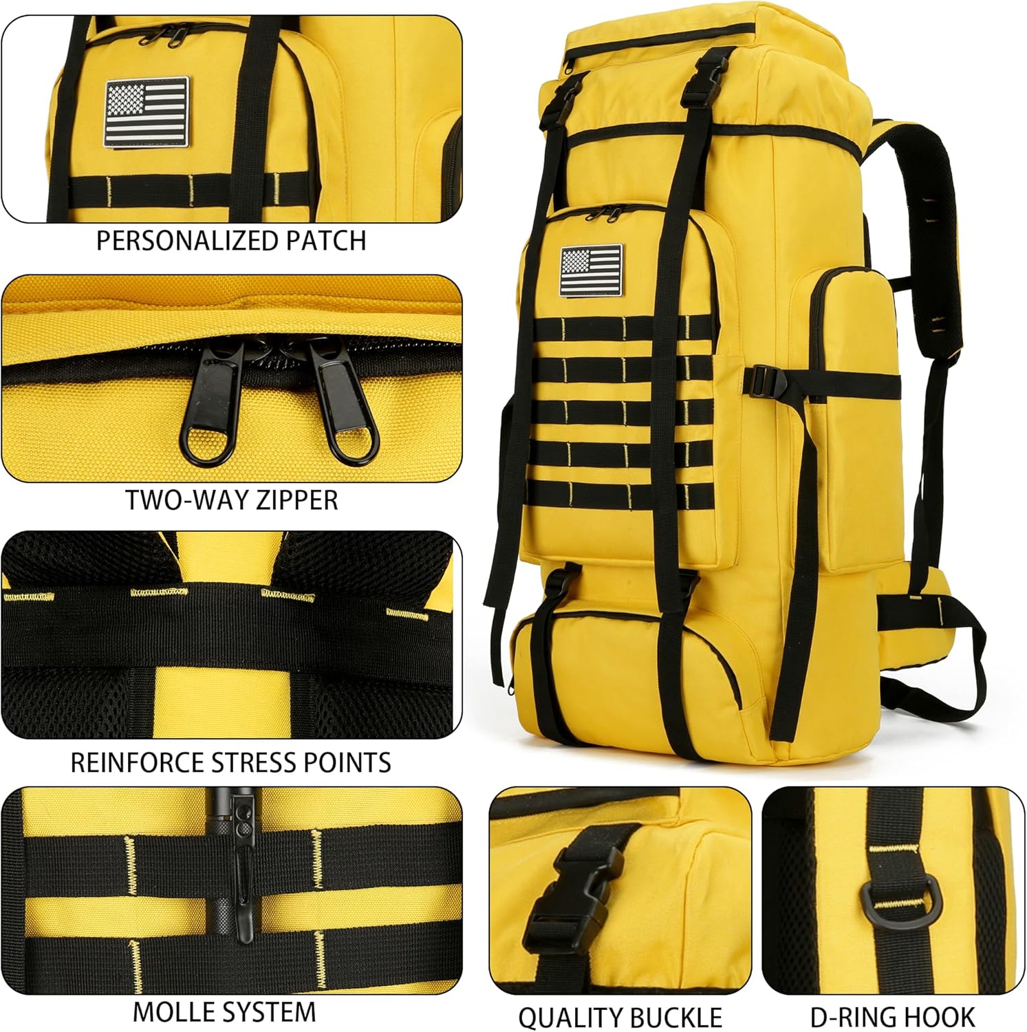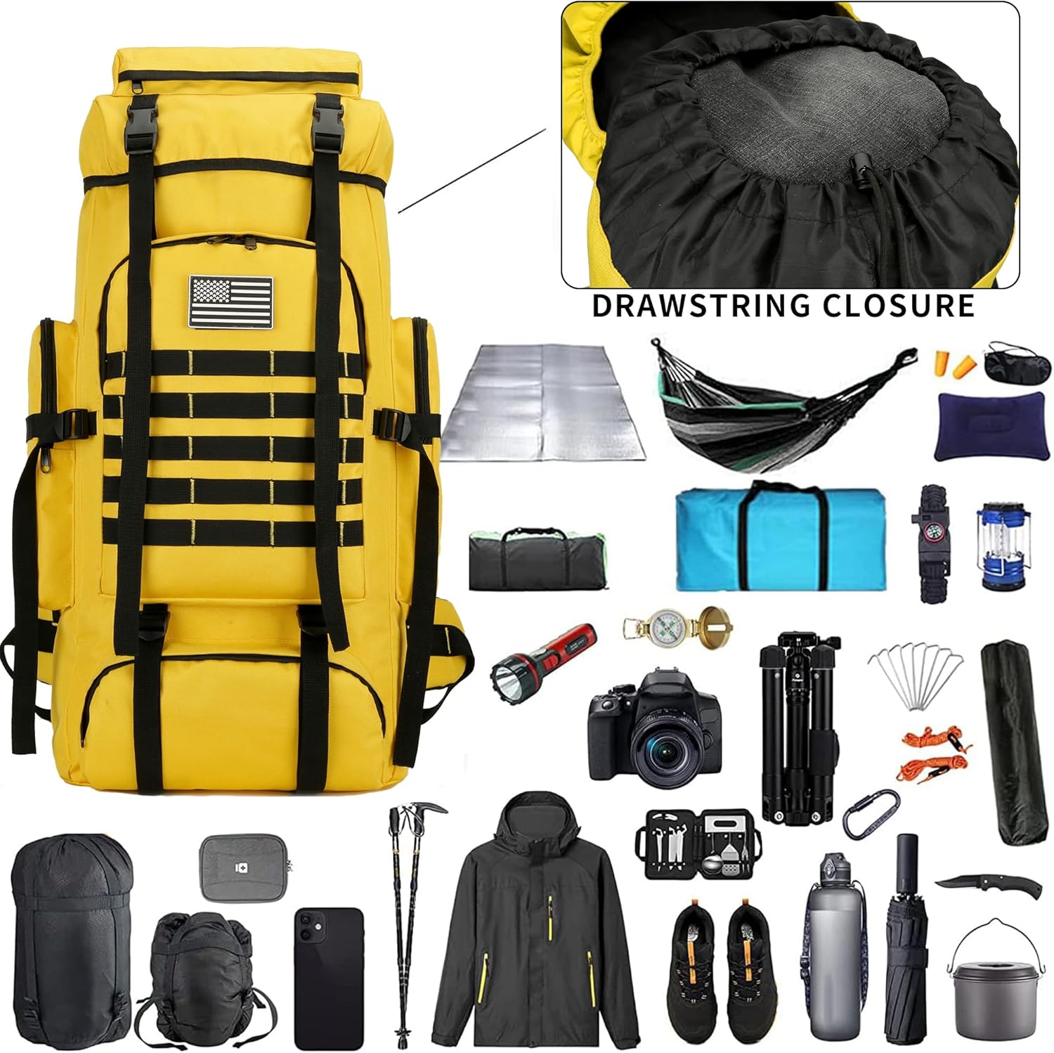 【Hiking Backpack Structure】: The 70L camping backpack main compartment is drawstring closed, hiking backpack roomy enough for you storage hiking gear, shoes and luggage, 1 laptop compartment, 1 front zipper pocket and 2 side pocket for separate and orderly storage.