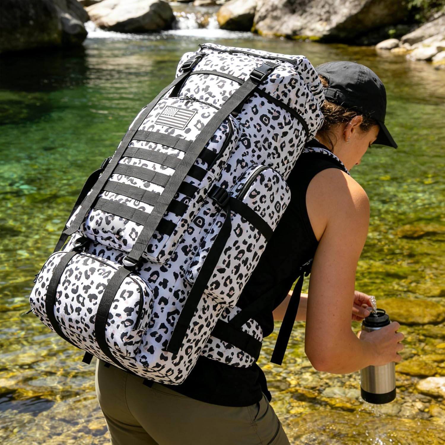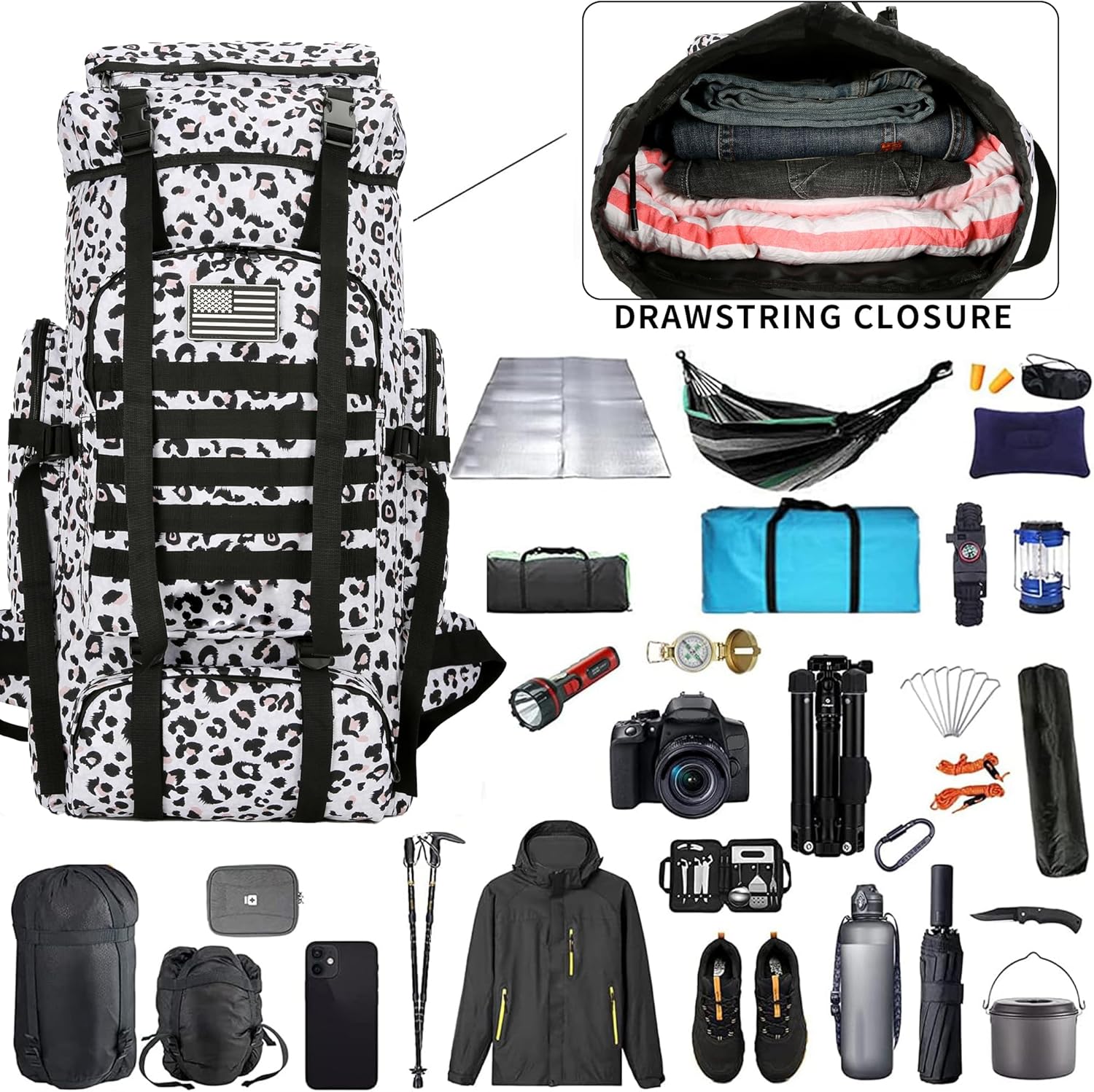 【Hiking Backpack Structure】: The 70L camping backpack main compartment is drawstring closed, hiking backpack roomy enough for you storage hiking gear, shoes and luggage, 1 laptop compartment, 1 front zipper pocket and 2 side pocket for separate and orderly storage.