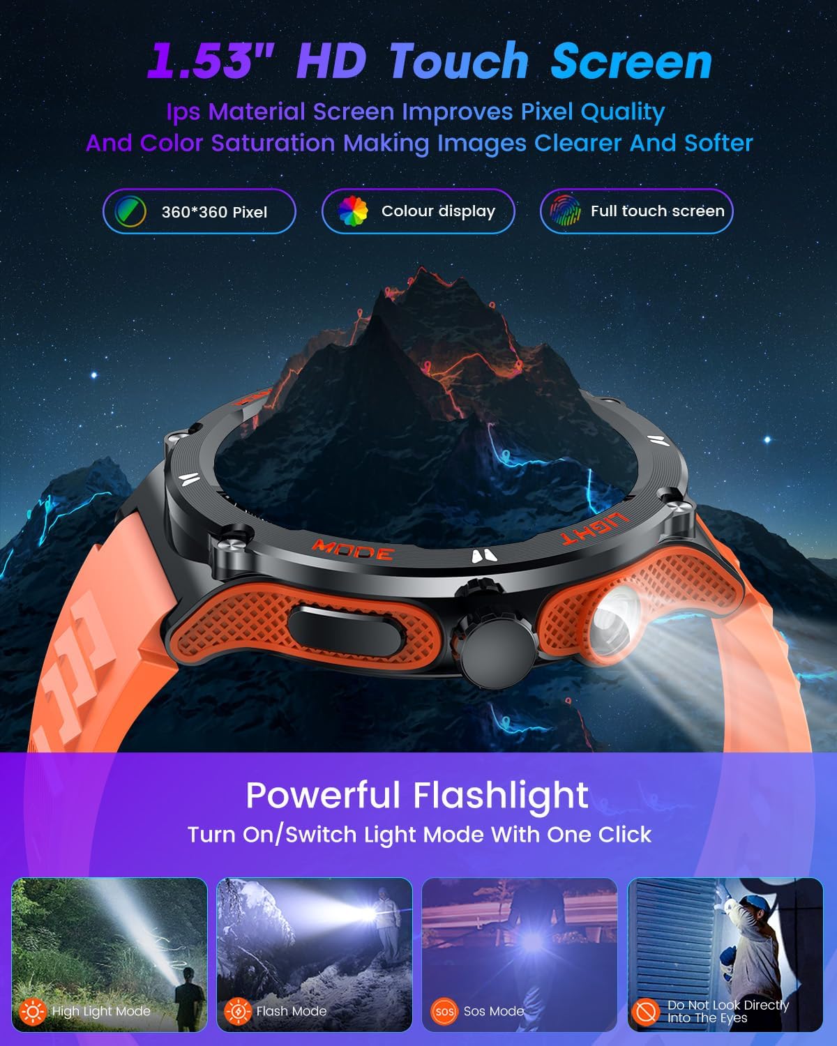 Smart watch for men Outdoor and Travel: Military SmartWatch men equipped with a strong flashlight on the side, with lighting distance of up to 6-8m, Whether you’re hiking, camping, or exploring at night, it can provide the necessary lighting. smartwatch flashlight has three lighting modes: strobe mode, signal mode, and lighting mode. The tactical Smart Watch for men also comes with a compass for exploring and outdoor activities, no longer to fear emergency situations in the dark or getting lost