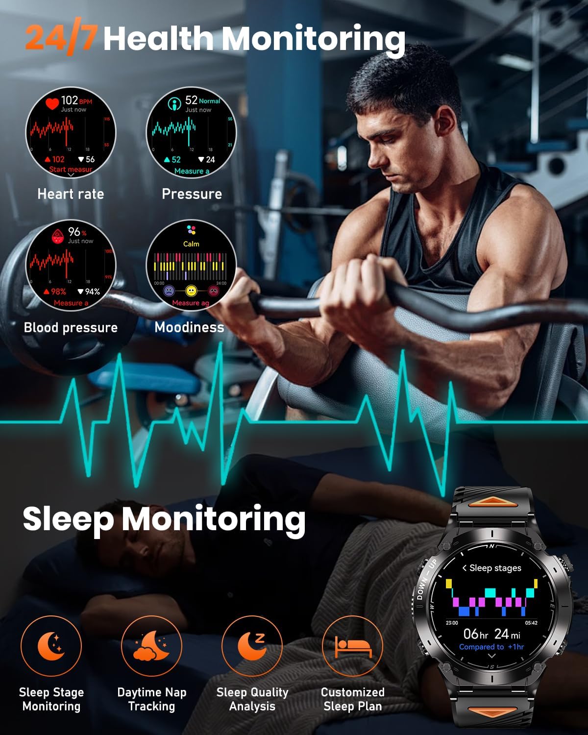 【24/7 Health Monitoring】 Track your wellness around the clock with advanced sensors that monitor heart rate, blood oxygen (SpO₂), sleep quality (light and deep stages), stress levels, and even emotional status. Get a clearer understanding of your body and mind, and sync all data seamlessly to the app for easy analysis. (Note: This is not a medical device. Data is for general wellness reference only.)