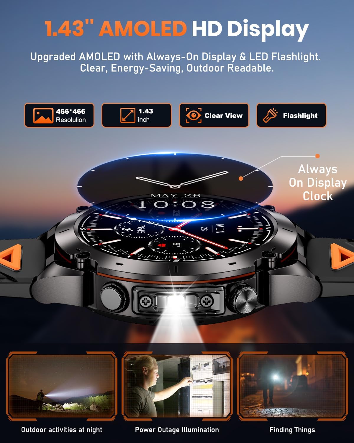 【Advanced GPS, Compass, Altimeter & Flashlight】 Equipped with the CC1165W chip, this smartwatch supports GPS, GLONASS, Beidou, and Galileo for fast, accurate global positioning. It also features a built-in compass and altimeter, providing real-time direction, altitude, and air pressure data—perfect for hiking, climbing, and outdoor exploration. The high-intensity LED flashlight offers reliable illumination for night walks, camping, or emergencies, and can serve as a distress signal when needed. (For best GPS results, use in open outdoor areas.)