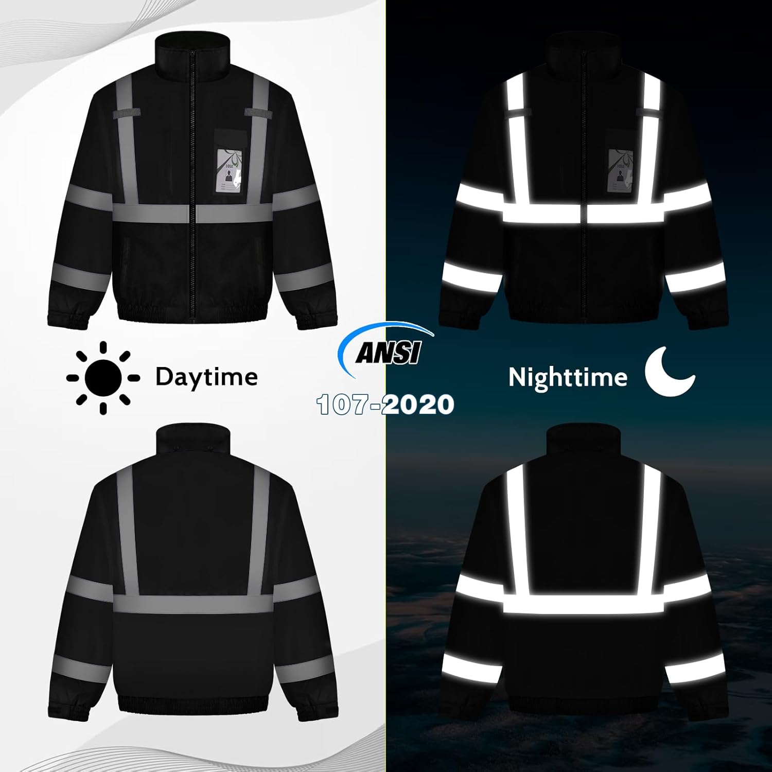 EXCELLENT DESIGN: Our reflective jacket features a detachable hood, an inner pocket, a vertical zipper pocket, a transparent ID holder on the left chest, and dual buckles on the shoulders. The large zippered pockets on both sides can hold items
