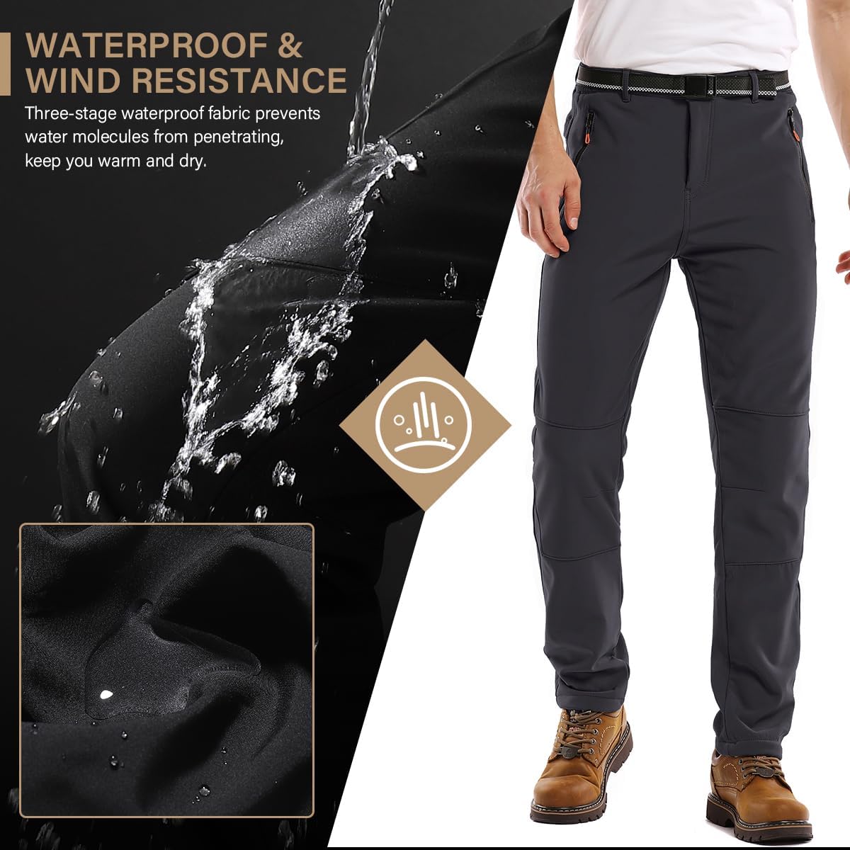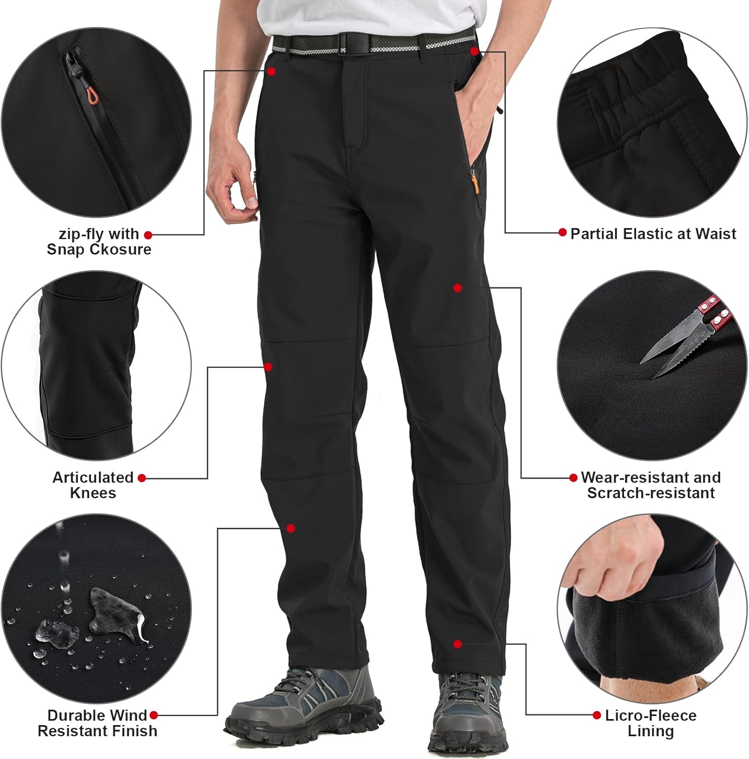 Waterproof Golf Trousers : Surface layer made of Three-stage waterproof treatment fabric, effectively prevents the water molecules from penetrating; Inner layer made of warm fleece give your skin a soft touch and effectively lock the heat.Thermal Fleece lined Trousers : Pants have a certain elasticity, freedom of movement, windproof and waterproof, and very warm, suitable for winter outdoor activities, such as hiking, mountaineering, travelling, skiing, walking, camping, fishing, motorcycle.Hiking Walking Trousers for Men: Slim fit designed to prevent cold air from being poured in, and the warmth will be better, also can be put into the boots without bloating and moving more freely.Snow Ski Trousers Men: 3D cutting of the knee position make it more comfortable for the leg to stretch. It is fleece lined and be water resistant for windy or snowy weathers.Softshell Trousers Men: Mid and high rise, elastic wear, windproof, waterproof, wear-resisting, keep warm, breathe freely, zipper pockets, with belt.