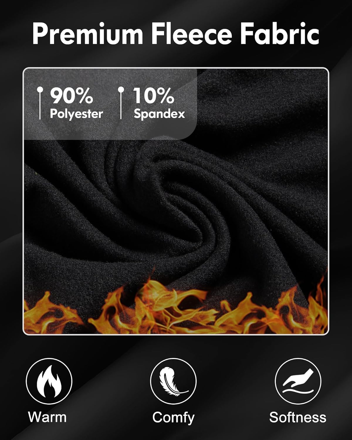 Men’s Thermal Compression Shirts: 90% soft polyester + 10% spandex with fleece lining for a velvety feel, warmth, and all-day comfort.