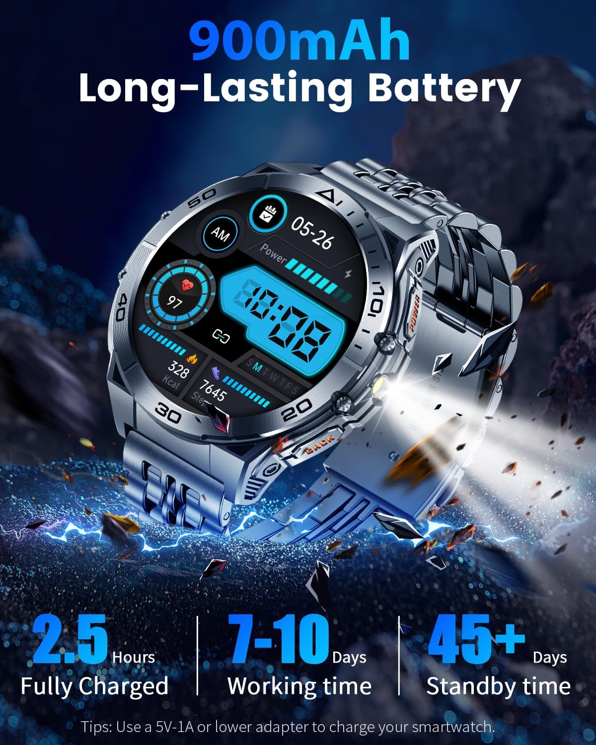 【900mAh Battery & Built-In Flashlight】 Equipped with a military-grade 900mAh battery, this smartwatch offers 10-15 days of use and up to 45 days of standby on just 2-3 hours of charging. It also features a built-in flashlight, making it an essential tool for camping, hiking, and nighttime activities. Whether you’re in an emergency or need extra light during car troubles, this smartwatch ensures you’re always prepared.