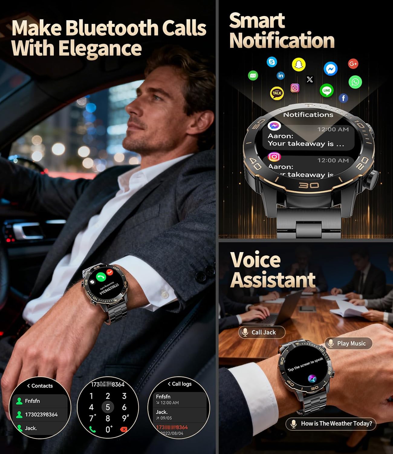 【1.43″ AMOLED Display & 2 Interchangeable Bands】This waterproof men’s smart watch features a 1.43″ AMOLED display with always-on functionality and low power consumption – allowing you to check the time anytime, anywhere. The two included straps:The elegant stainless steel business-style band is perfect for business meetings, while the soft silicone sport-style band is ideal for sports. Both bands are waterproof, sweatproof, and skin-friendly soft – the ultimate choice for men’s watches!