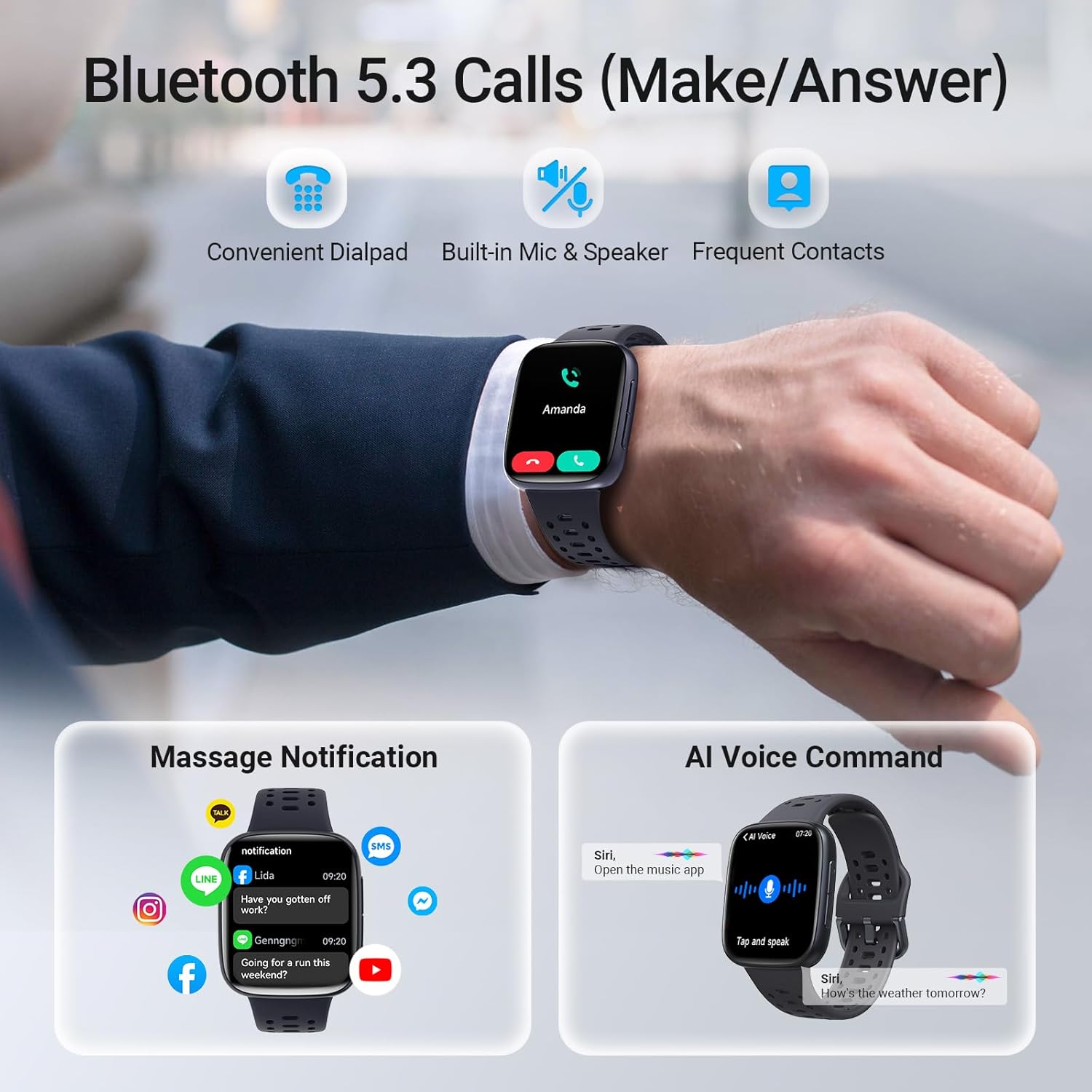 【Bluetooth Call & AI Voice Command】Thanks to Bluetooth 5.3 & Built-in Mic/Speaker, fitpolo smart watch allows you to make/answer clear calls on your wrist conveniently. This smartwatch can control your smartphone’ AI voice assistant (Such as Siri, Bixby, Google Assistant). Just speak to the watch to ask questions, control music playback, check the weather, set alarms and timers and so on, making your life to be smarter.