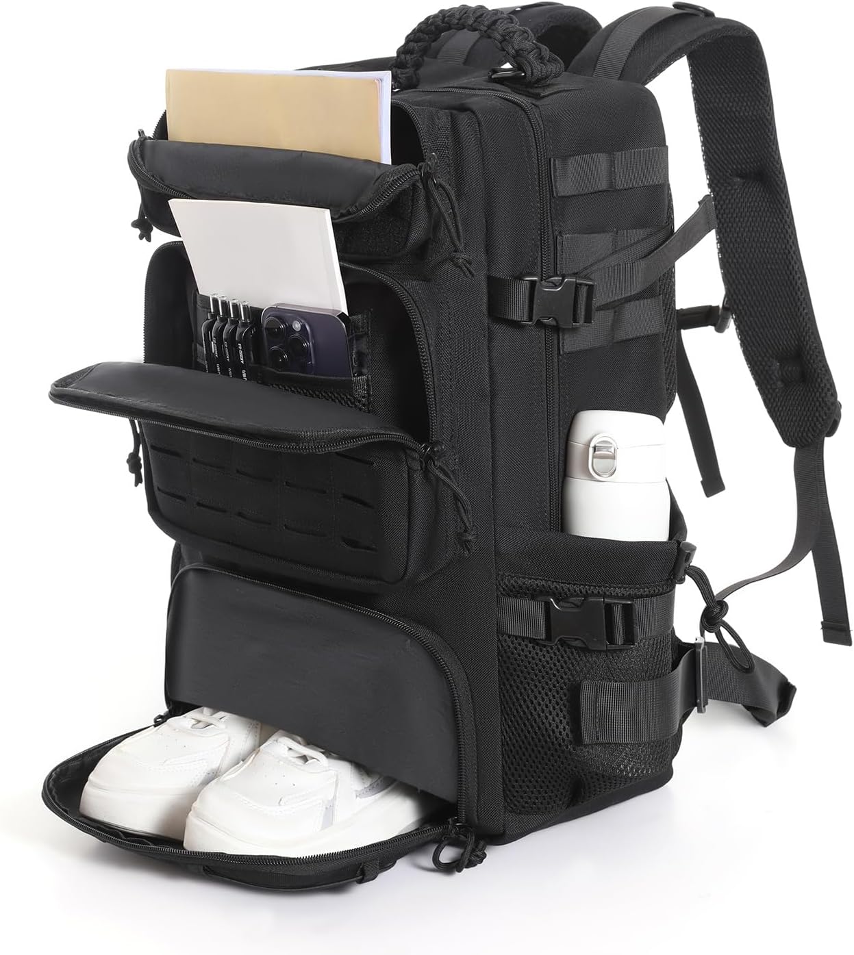 Durability: The Tactical Travel Backpack is constructed of heavy-duty 1000D polyester fiber material with reinforced stitching at stress points for long-lasting performance.