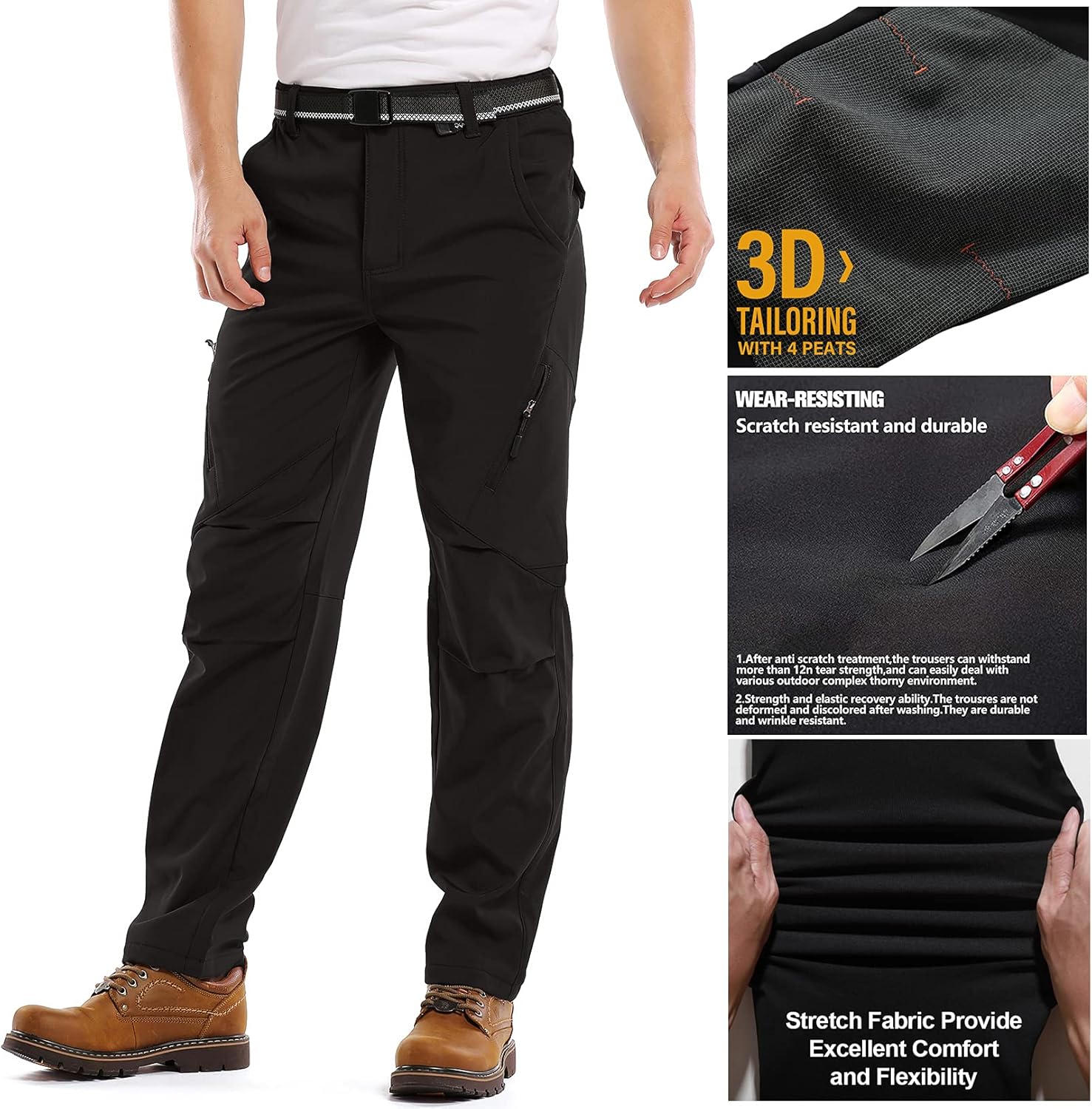 Insulated Winter Hiking Pants: 3D Cutting / Mid and high rise/ Side elastic waist allows pants to fit comfortably. Mens insulated pants features 4 large-capacity pockets and 2 button back pockets to keep your phone,wallet,key,tactical gears or other accessories for ultimate safely, convenience and efficiency while moving.