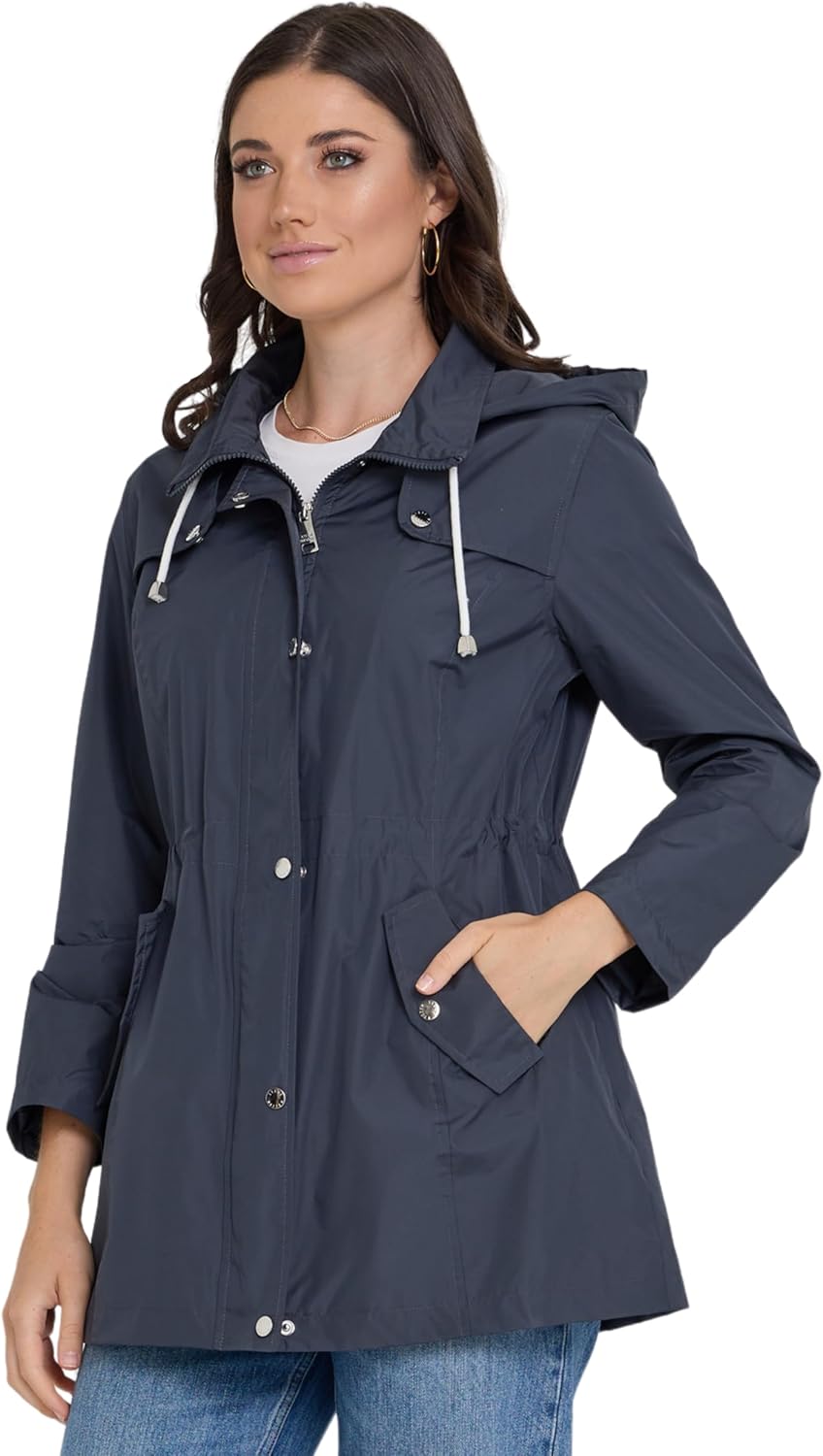 The rain jacket with full length zipper and snap closure with storm flap