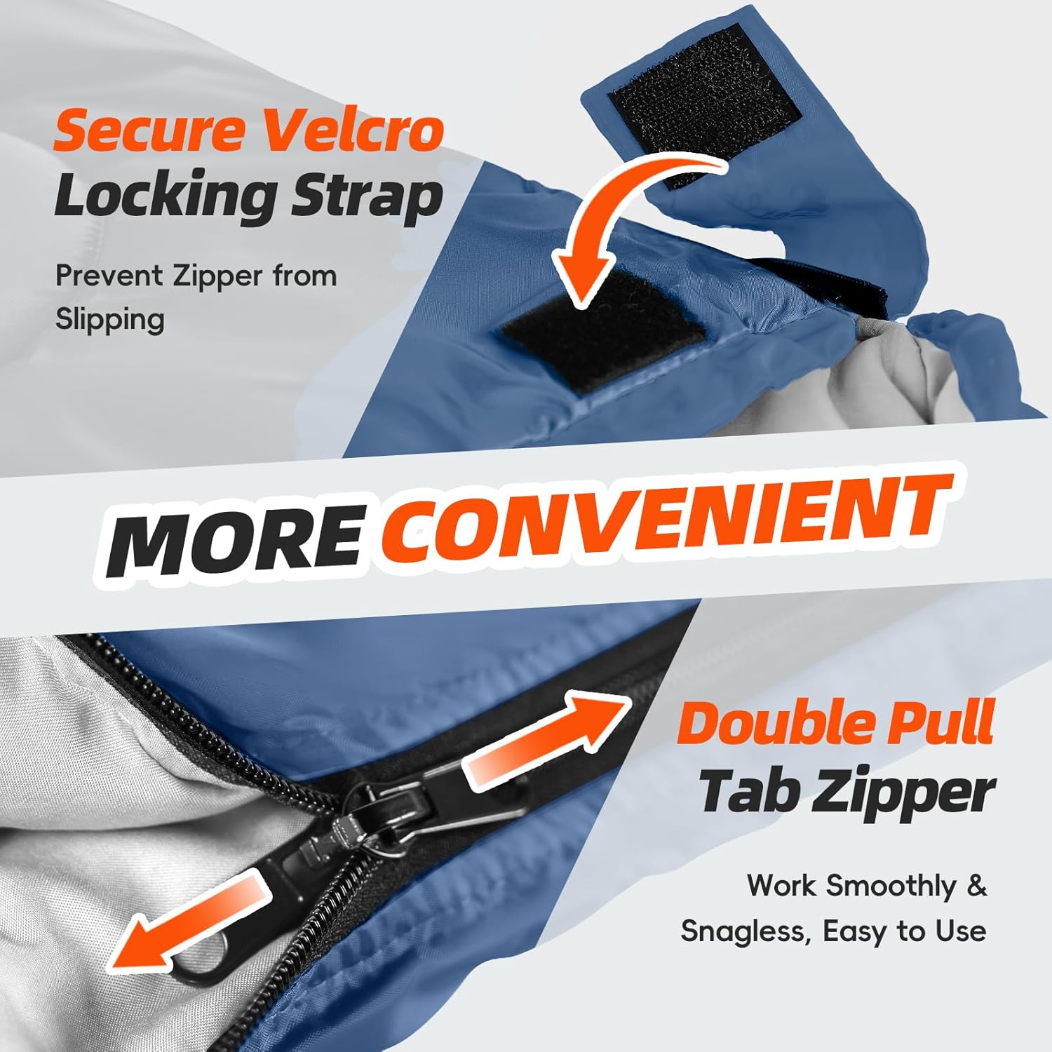 EXCELLENT DESIGN : The double pull tab zipper on the right side makes it easy for you to open and close from inside or outside, work smoothly & snagless. The zipper at the bottom lets you ventilate the foot section for better temperature control. On warm nights, unzip it and use like a blanket