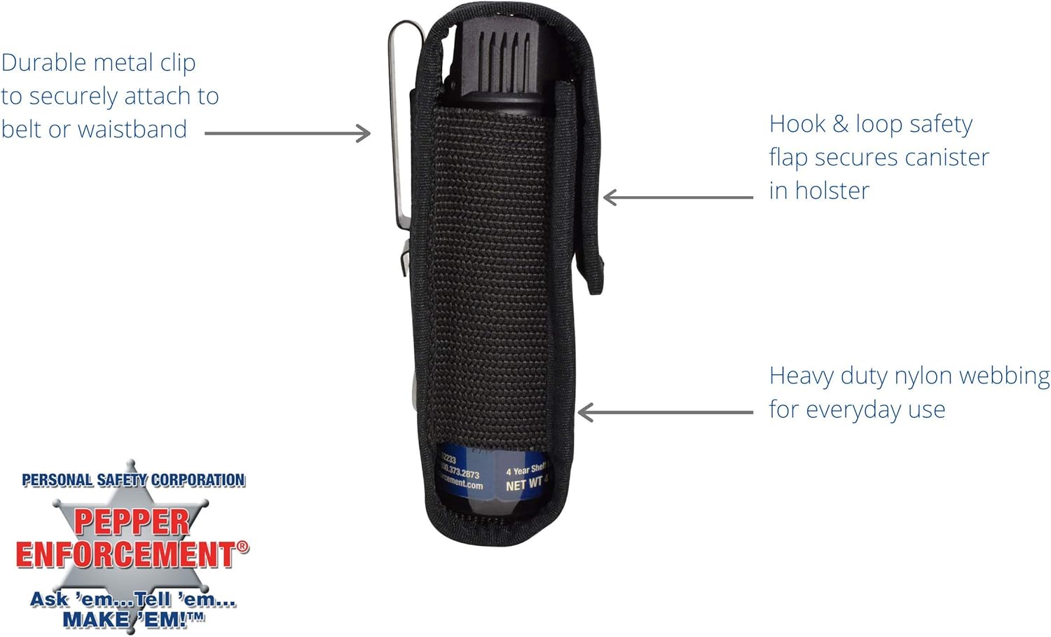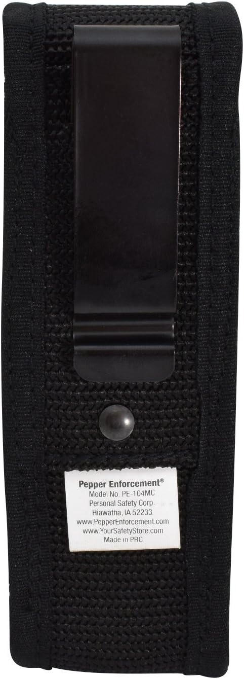 Pepper Enforcement tactical metal belt clip pepper spray holster is designed to meet the requirements of active-duty law enforcement officers, security guards, and prepared citizens.Heavy-duty hook-and-loop closure secures spray canister in the holster. The durable metal clip quickly and securely attaches holster to most belts, duty belts, waistbands, etc.Holster is constructed of heavy-duty nylon material that is made to withstand the rigors of professional law enforcement and security guard use.Trust in a brand used by police departments and concerned citizens across the U.S. since 1991.