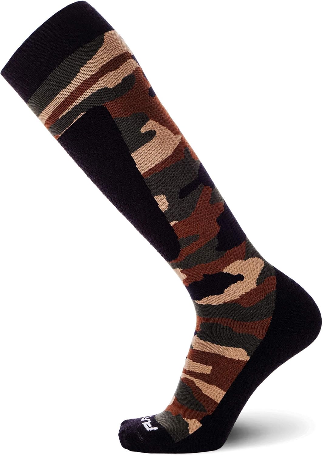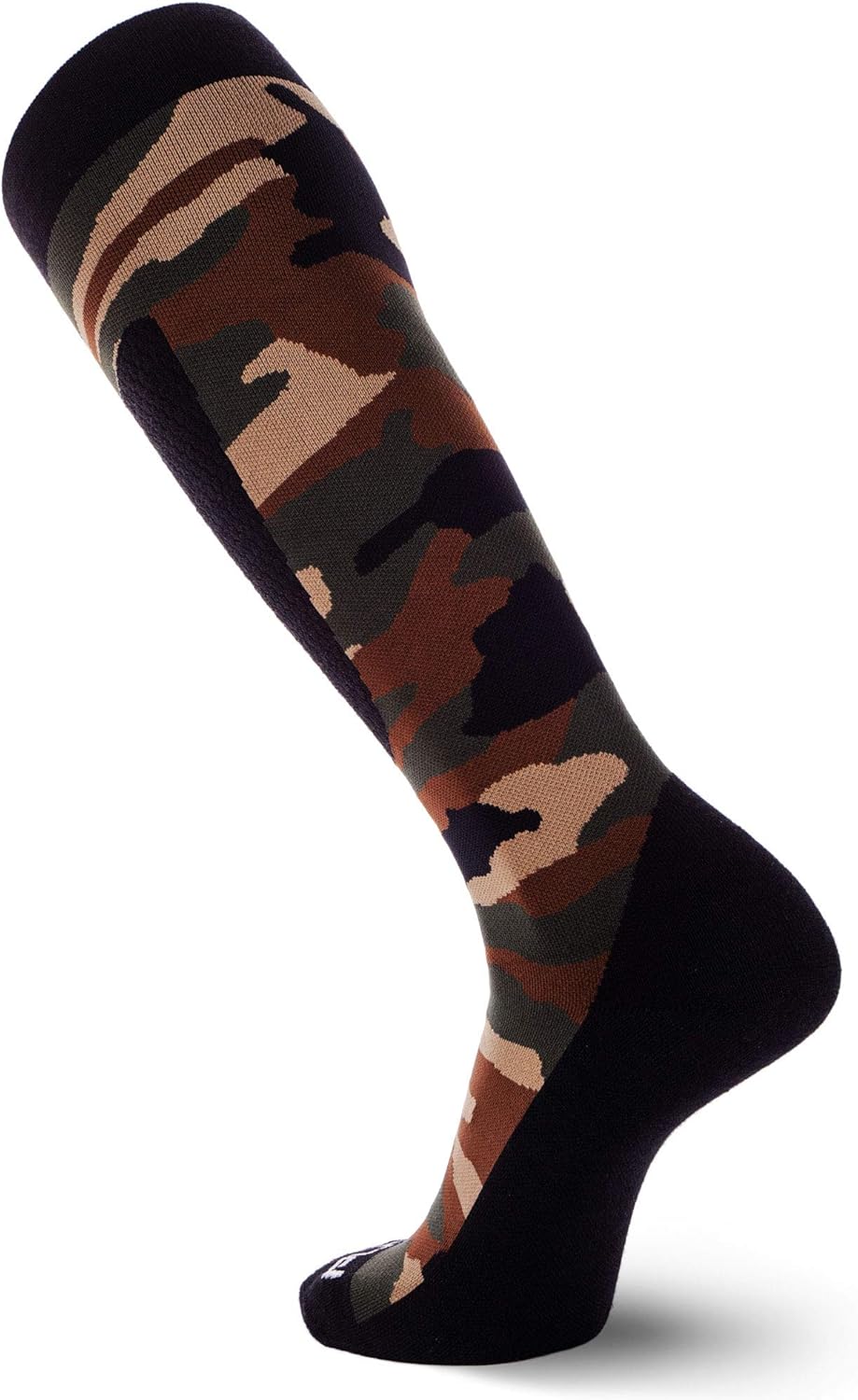 The Pure Athlete Camo Snowboard Socks are our top pick for an over the calf (OTC), super soft and comfortable merino wool ski and snowboard gear sock. Engineered as both mens and womens for wearing all day on the slopes and constructed from high-quality warm merino wool, these ski socks will stay dry throughout any cold weather outdoor sports activity. Whereas cotton ski socks retain moisture and can become soggy and heavy, Merino Wool is naturally moisture resistant, wicking moisture away and keeping feet dry and resisting stink, sweat, and staying breathable and warm! Not only do the original ski socks work for skiing and snow sports, but any snow or winter activities and outdoor sports such as hiking, trekking, camping, hunting, ice fishing, and playing winter sports. The Pure Athlete original ski socks are designed with performance zones that have ideal lightweight cushioning and shin guard features in ski boots. Cushioning is thin enough to be breathable, but warm enough to act as a thermal sock in cold weather.