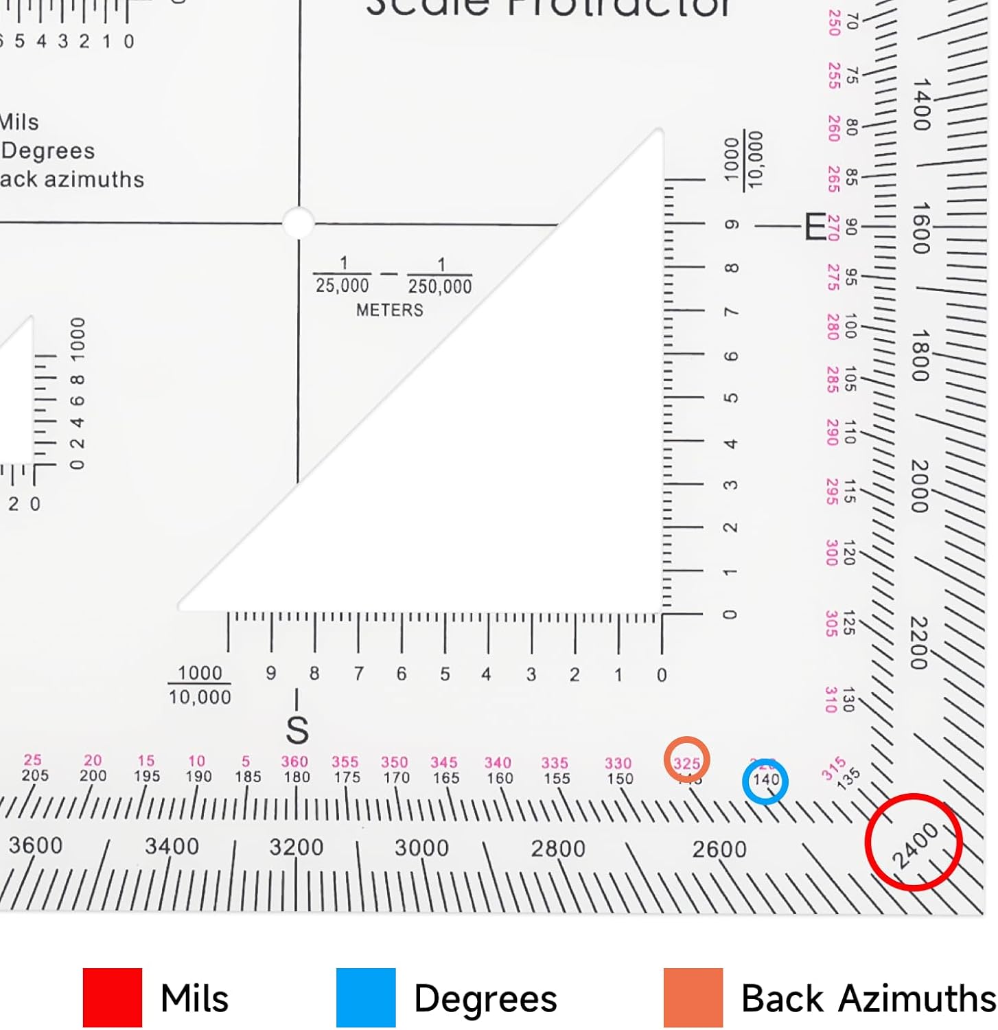 This military protractor was specifically designed to help you be more accurate. The scale has three die cut triangles for access to mark the map being measured.