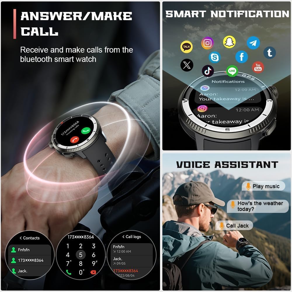 【2025 NEW Bluetooth 5.4 Call & Voice Assisstant】With advanced Bluetooth 5.4, the fitness tracker lets you make and receive calls directly from your wrist, ensuring seamless communication anywhere. Mens watch also supports information reminders and social media notifications (WhatsApp, Facebook, Message, Instagram, Twitter, Wechat, etc). Additionally, You can also use the built-in voice assistant to ask questions, control music playback and more.