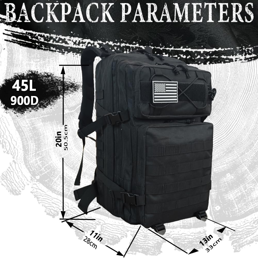 THE SPACE YOU NEED:This Military Tactical backpack size appro: 18inch x 13.2inch x 11.6inch dimensions and appropriately sized 45L capacity, this pack has room for all of your essential gear. Large multi-layer interior storage compartments can accommodate a lot of outdoor equipment, and also meet your daily travel needs. Suitable for fitness, outdoor travel, hiking and other outdoor activities