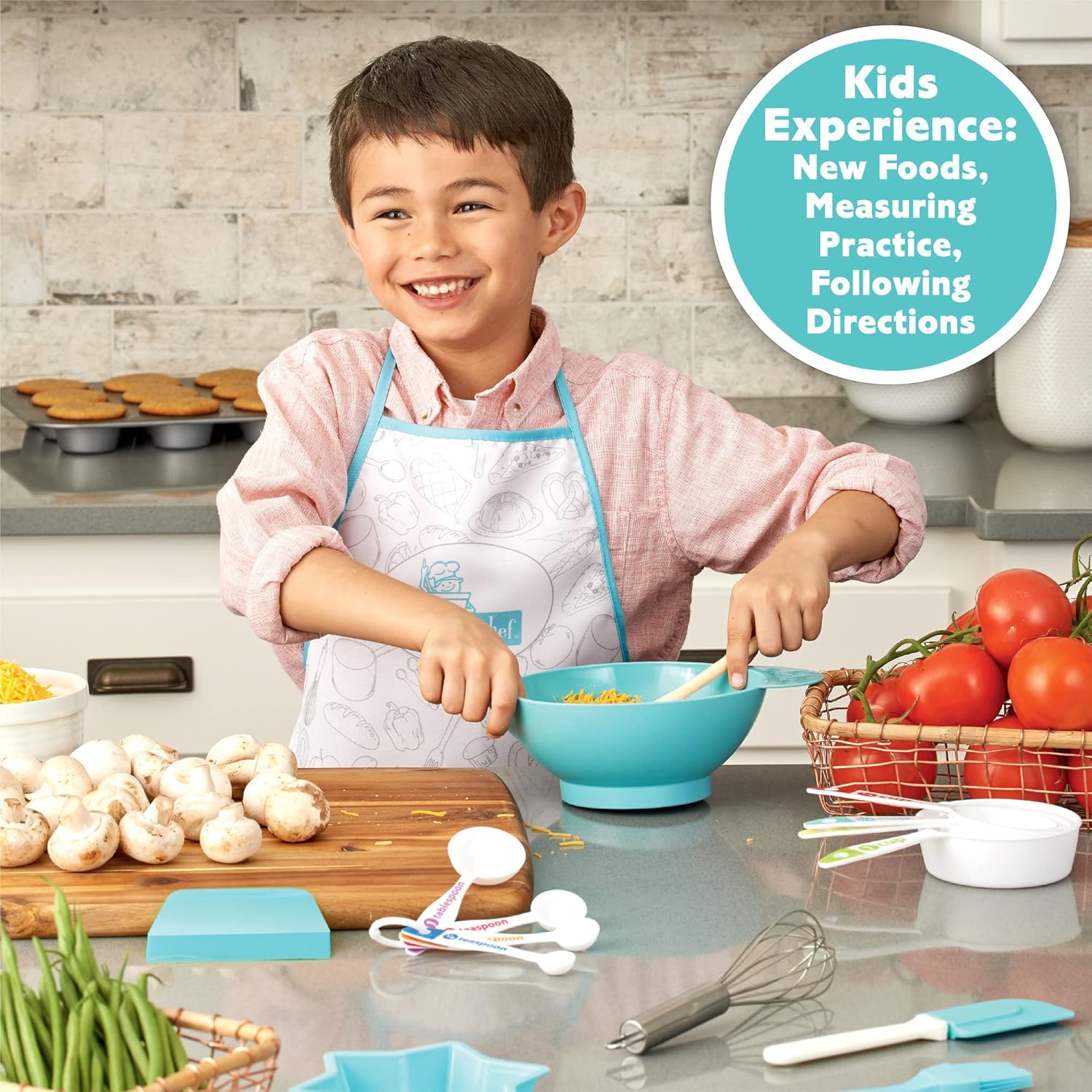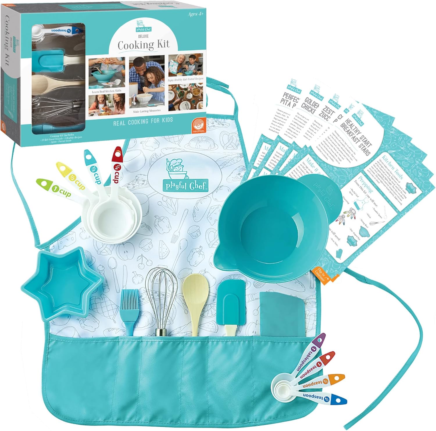 Includes: 4 color-coded measuring cups, 4 color-coded measuring spoons, silicone basting brush, wooden spoon, stainless steel whisk, handled bowl with spout, star-shaped silicone pan, plastic bench scraper and recipe book with parent guide, plus 1 durable fabric apron. Apron fits ages 4 to 10. (Ages 4 and up)