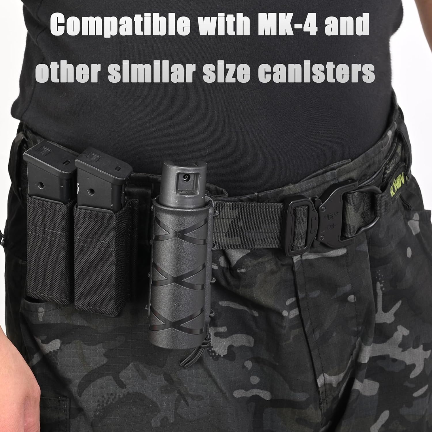 Universal Pepper Spray Holster:OC spray pouch size:4.3”×1.5′(L×W).It fits MK4,flashlight/radio of similar diameter and height,as well as other canisters and gear silimar.NOTE: Measure the diameter of the pepper spray canister before purchasing.Make sure it is close to 1.4~1.5 inches.Then measure the height from the bottom of the can to the bottom edge of the lid,making sure it is close to or above the height of our molle OC spray pouch