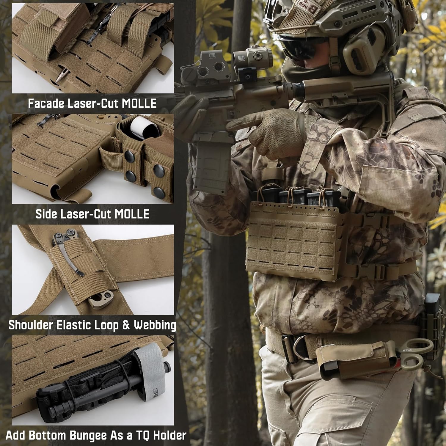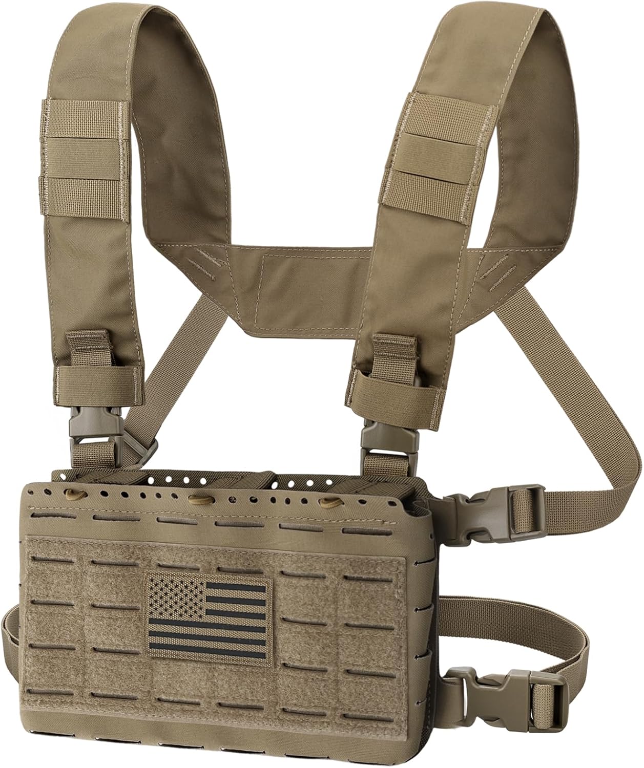 MOLLE CHEST RIG: Chest Rig Bag equip with a MOLLE Laser Cut front loop that can attach additional tactical gear,molle pouch, molle accessories,and other patches. Some molle webbing on the shoulder is also for attaching radios, small molle pouches, comms wires, or hydration tubes. US Patch is included.
