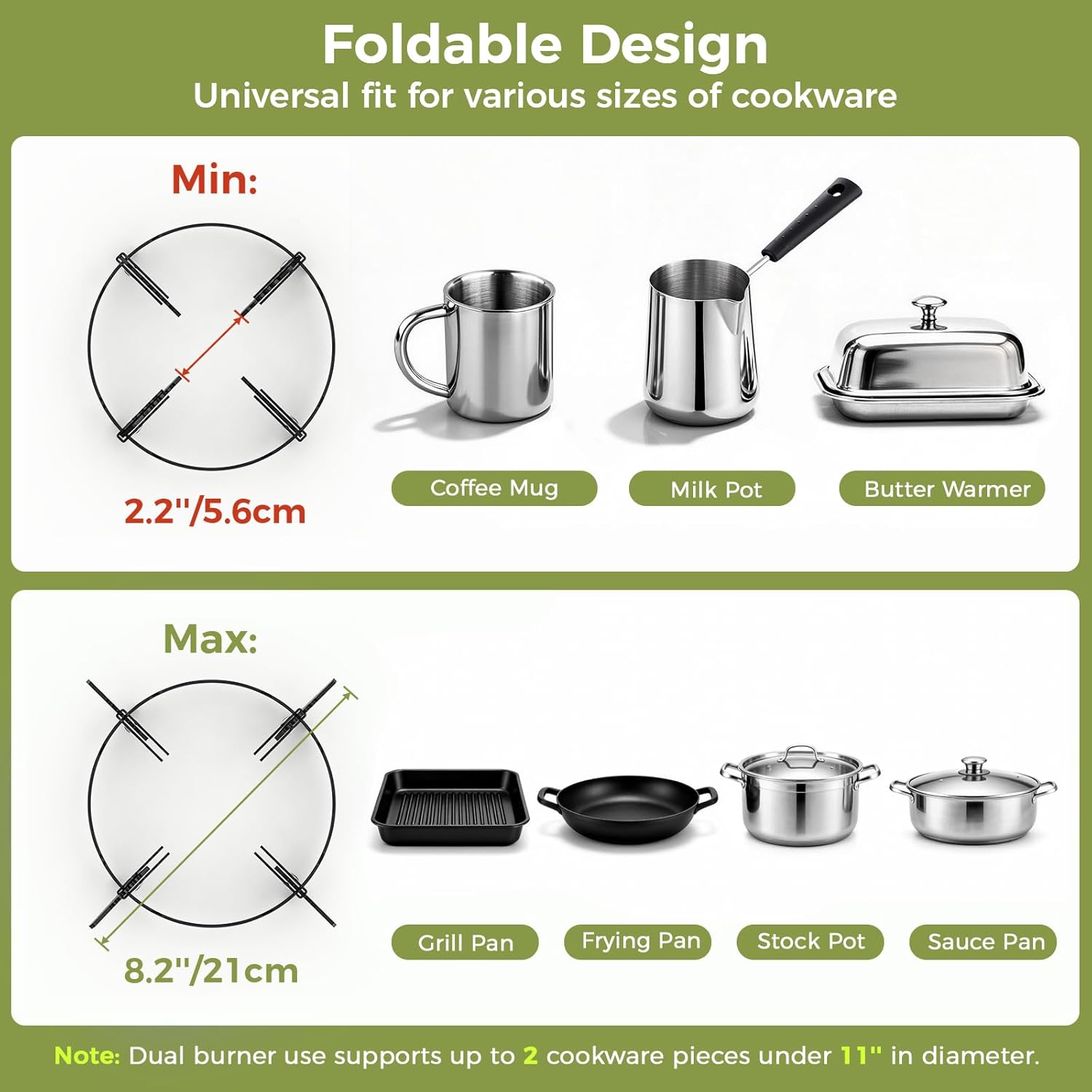 Unique Windproof Folding Grates: The camp stove features 25mm-raised hollow grates, effectively shielding against wind interference to ensure stable flames and safe outdoor cooking. No need for extra bulky windshield. Its support diameter can be adjusted from 2.2” to 8.2”, fitting a wide range of cookware from coffee cups to standard pots and pans. Note: Dual burner use supports up to two cookware pieces under 11” in diameter.