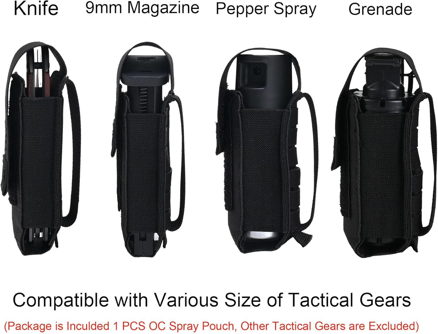 MOLLE/PALS compatible of OC pouch:MOLLE pouch has 1 webbing and 7 laser-cut slots in back.You can attach pepper sprayers to combat belts,tactical vests, and tactical backpacks.