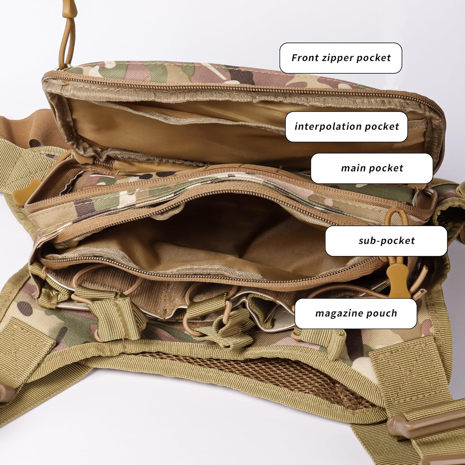 SPACE: Includes a front zipper pocket, main zipper pocket, and hidden pistol pocket. The main pocket is divided into 9 sections with a mesh partition for organizing EDC items. Molle panel allows for additional tools and morale patches.