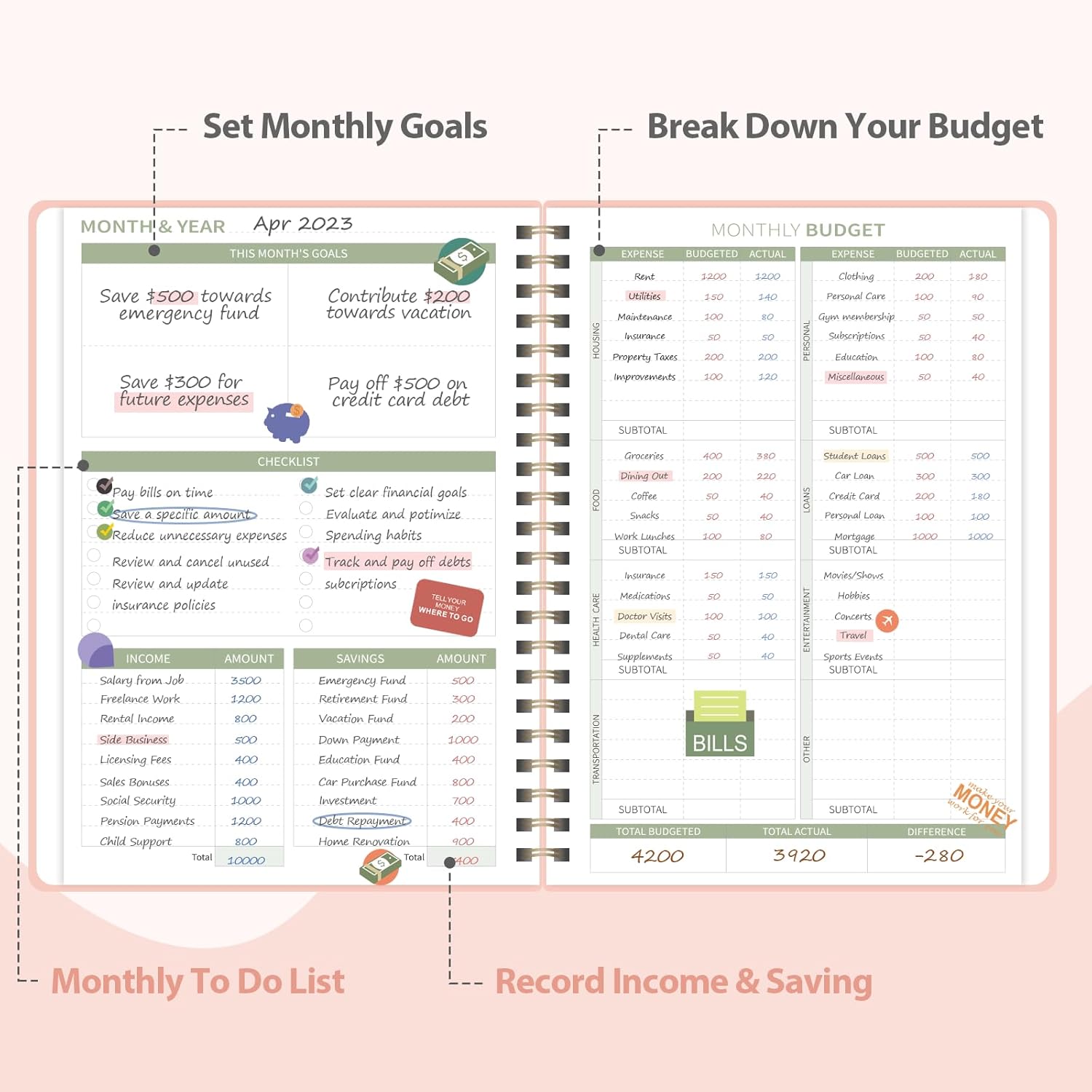 [EASY-TO-USE LAYOUT] – The budget plan book features a easy-to-use layout designed for effortless money management. Each month features dedicated budget pages to set financial goals, track income, and plan expenses. Additional sections include debt trackers, savings goals, bill payment trackers, and more, making it simple to stay ahead of your finances.