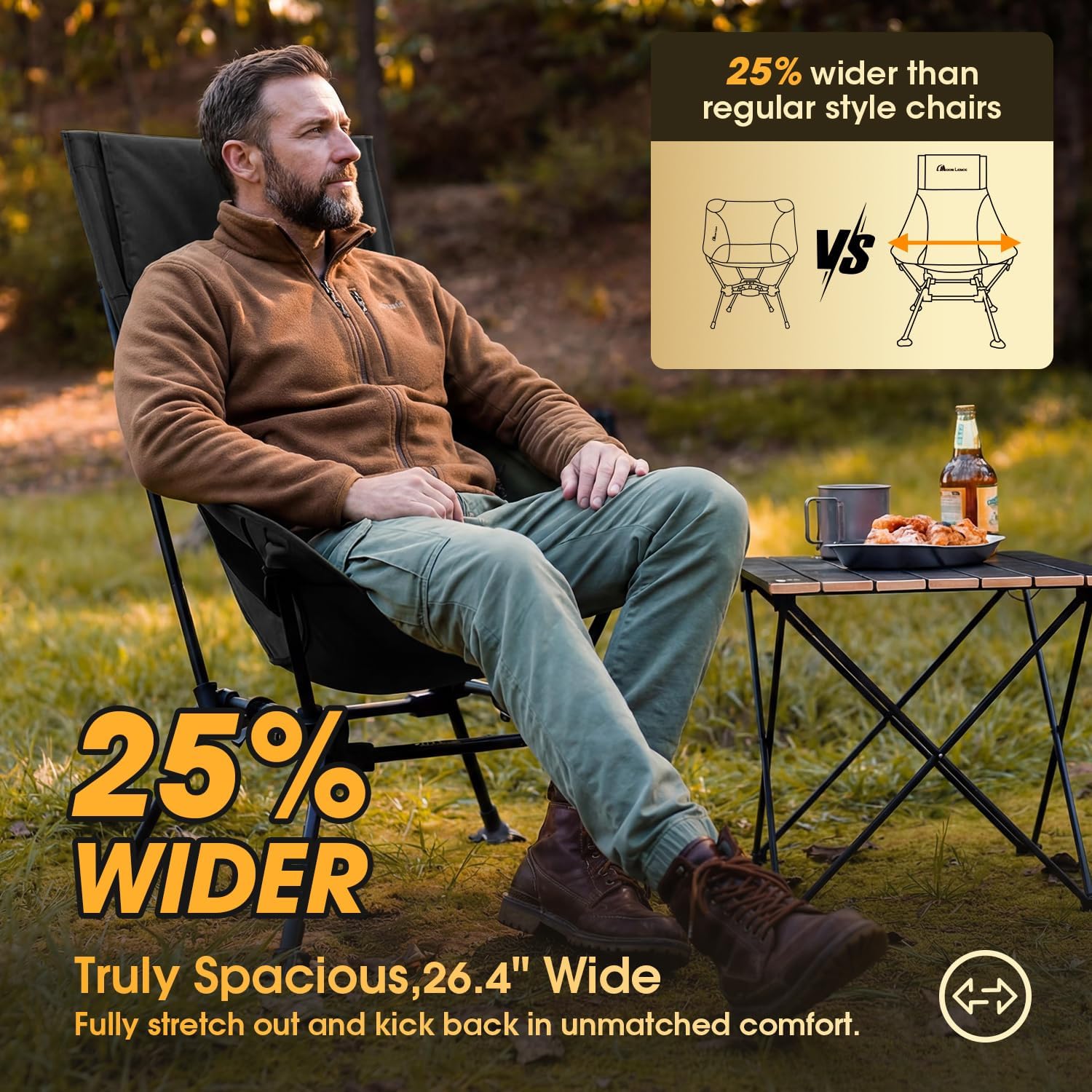 【Oversized for Adults】Experience exceptional comfort with our extra-wide seat, measuring a generous 26.4 inches across. This high back camping chair provides ample room for users of all sizes, offering comfort for extended relaxation. The expanded seating area ensures unrestricted comfort at campsites, backyard gatherings, fishing, and outdoor events.