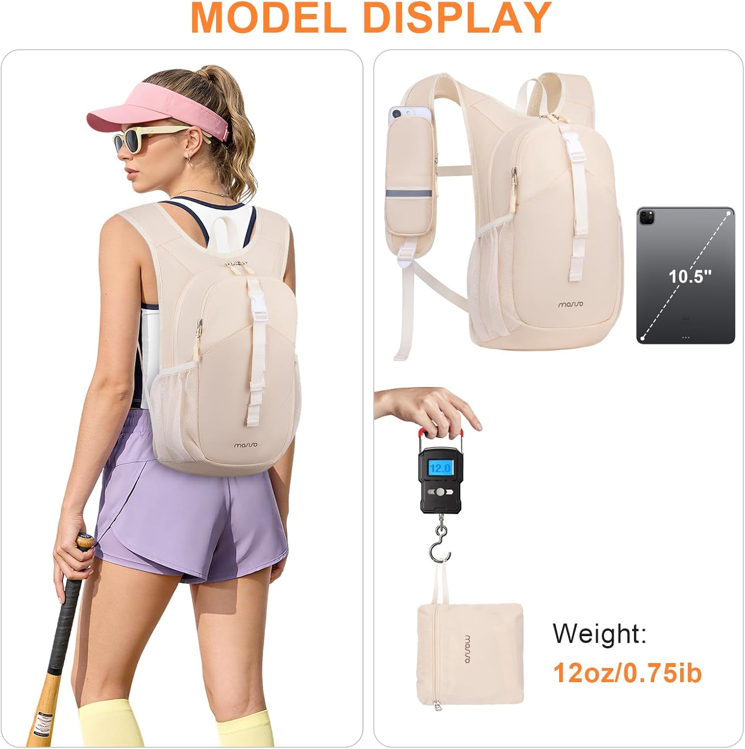 10L Lightweight Hiking Backpack. Dimensions of this lightweight daypack: 15.55 x 9.06 x 5.12 inches (L x W x H). Folded size: 7.87 x 7.48 inches (L x W). This compact hiking backpack is easy to fold into its small pouch (its own inner pocket for packing). This small hiking backpack is only 12 oz, the lightweight folded size can be easily stored in pockets, suitcases, handbags and other bags for easy carrying and use.