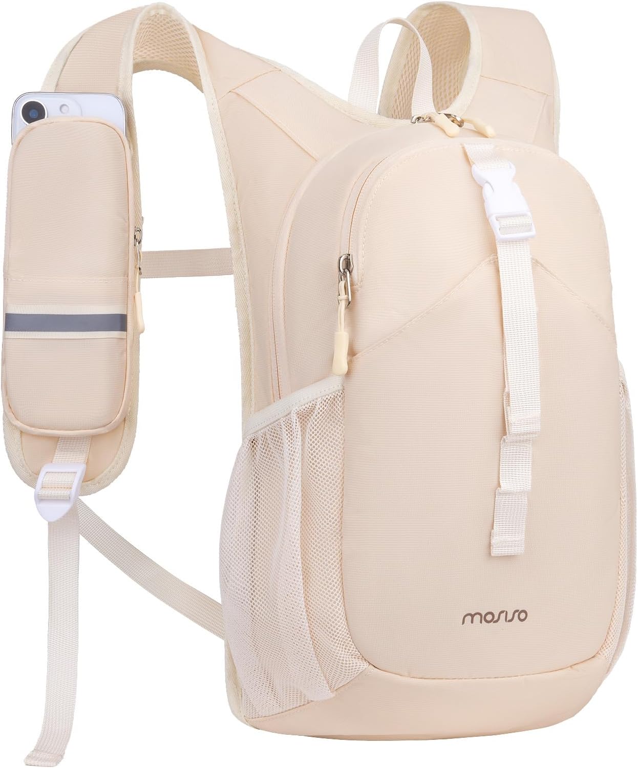 Hiking Daypack with Phone Pouch. This hiking backpack has 10L capacity and 3 compartments. This camping backpack has a main compartment that has enough space for clothing, hats and other outdoor/travelling stuff. 2 pockets on the shoulder strap, one phone pocket (up to 6.5 inch cell phone), one elastic pocket. 1 front quick access pocket is convenient for storing your frequently used items. 1 anti-theft pocket is designed on the back for your wallet, cellphone, keys and other precious items.