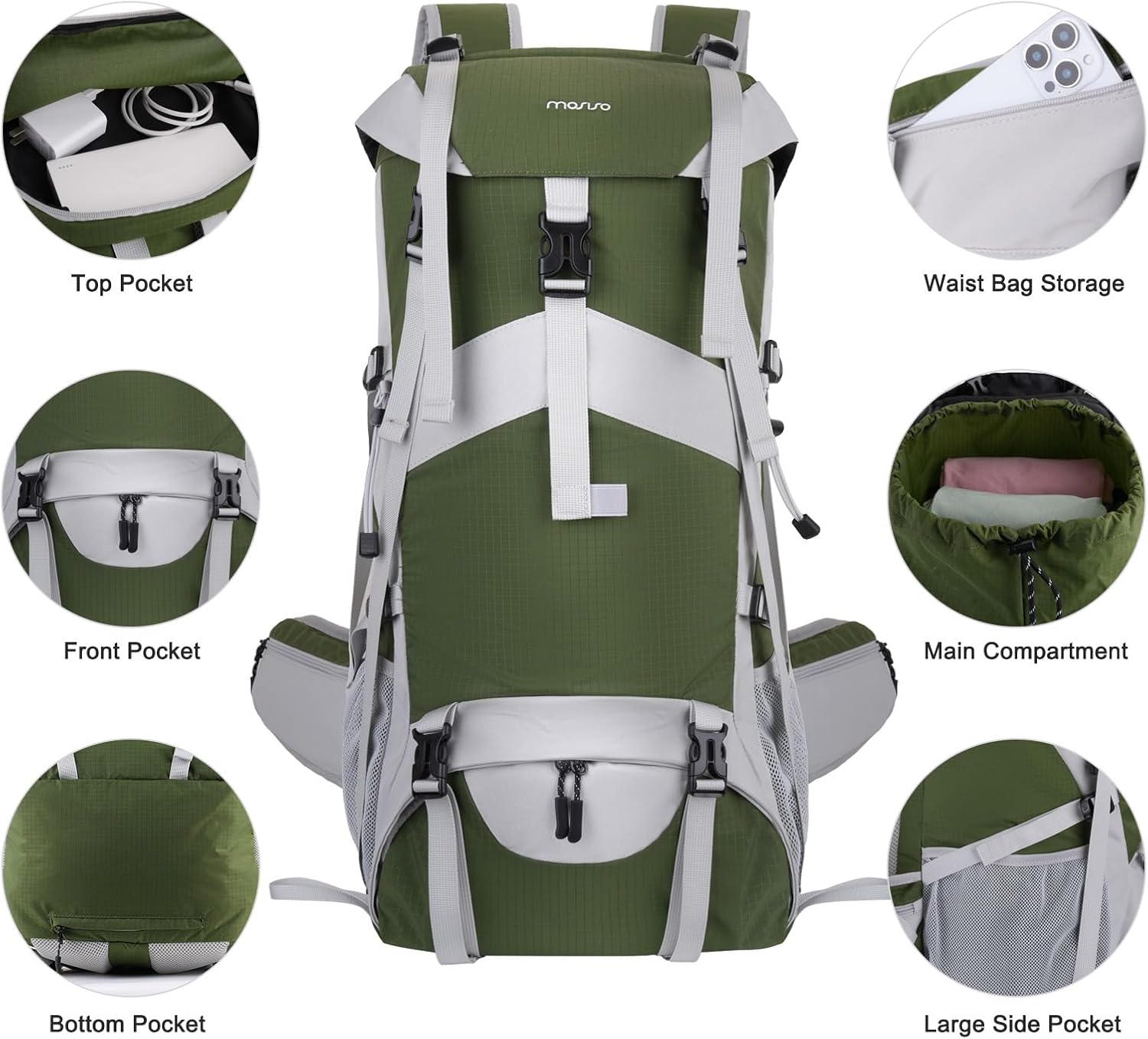 Large Capacity Camping Backpack. This hiking backpack has 50L capacity. This camping backpack has a main compartment that has enough space for clothing, hats and other outdoor/travelling stuff. The backpack offers spacious storage with a main compartment, 1 top pocket, 2 hip belt zipper pockets, 1 front separate shoe compartment, and 2 mesh side pockets. Additionally, a dedicated bottom pocket is designed for storing the rain cover.