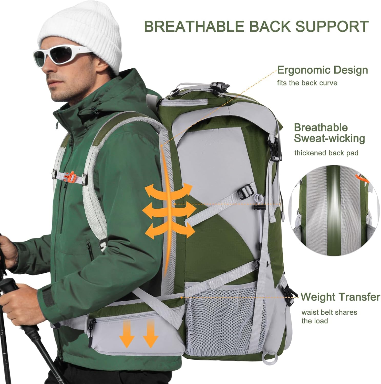 Ergonomically Designed Hiking Backpack. Our hiking backpack is ergonomically crafted for 2-3 day adventures, featuring breathable materials and padded shoulder straps for unparalleled comfort. It delivers ultimate support during long-distance hikes and backpacking trips. The sternum strap buckle is designed as a survival whistle, allowing quick and easy access in emergencies.