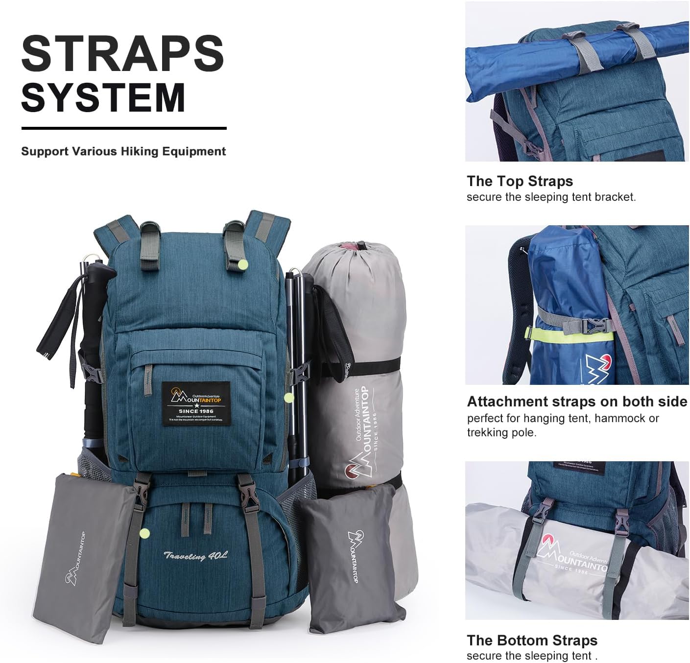 Storage Space: This 40L camping backpack has multiple pockets and storage compartments. The main compartment can accommodate a 15.6-inch laptop; the side pockets and hip pockets are perfect for storing smaller items.