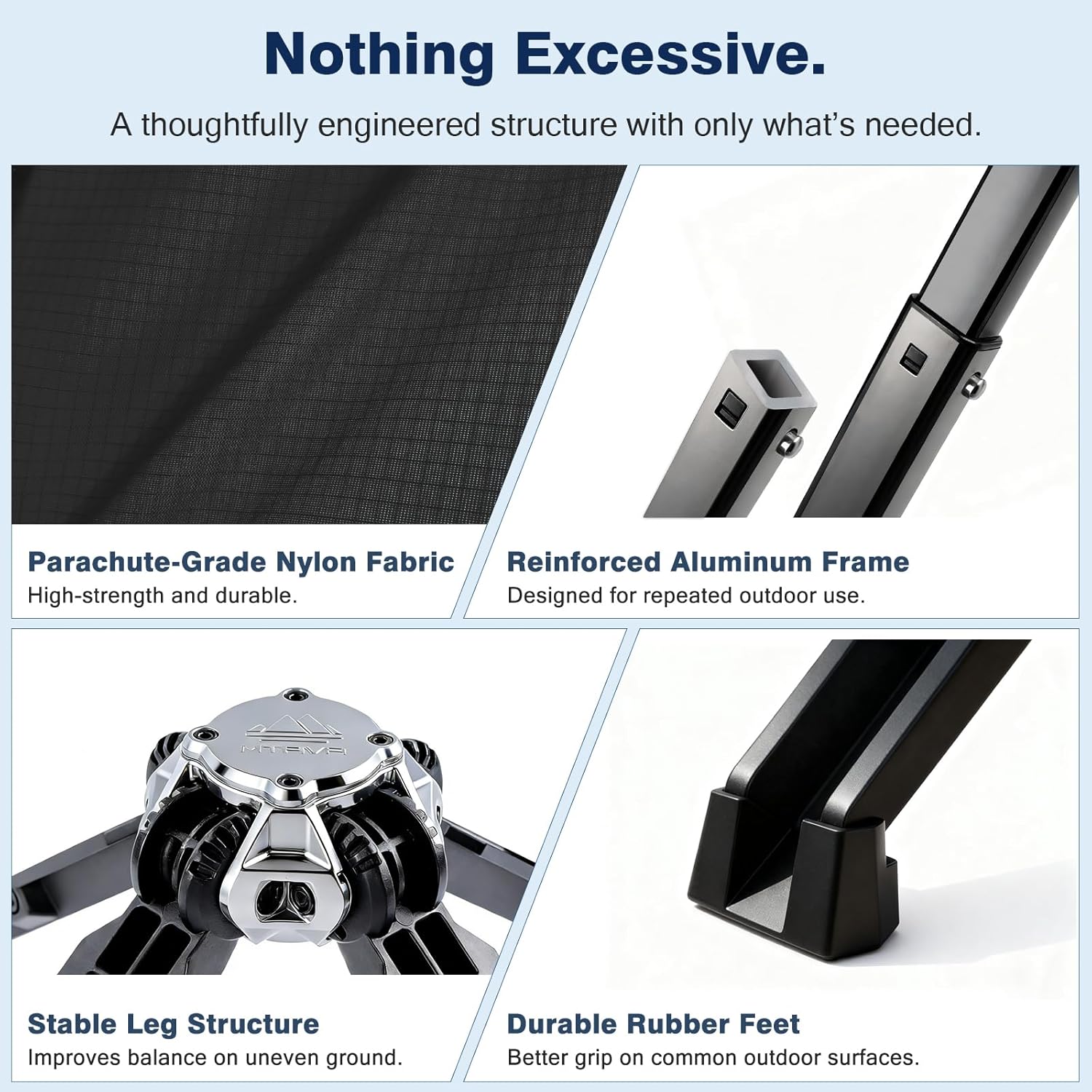 Utility-Grade, Balanced Support Design: Designed with a focus on stable, balanced support rather than plush lounging. The reinforced aluminum structure provides reliable seating for camping, fishing, and long periods of everyday outdoor use