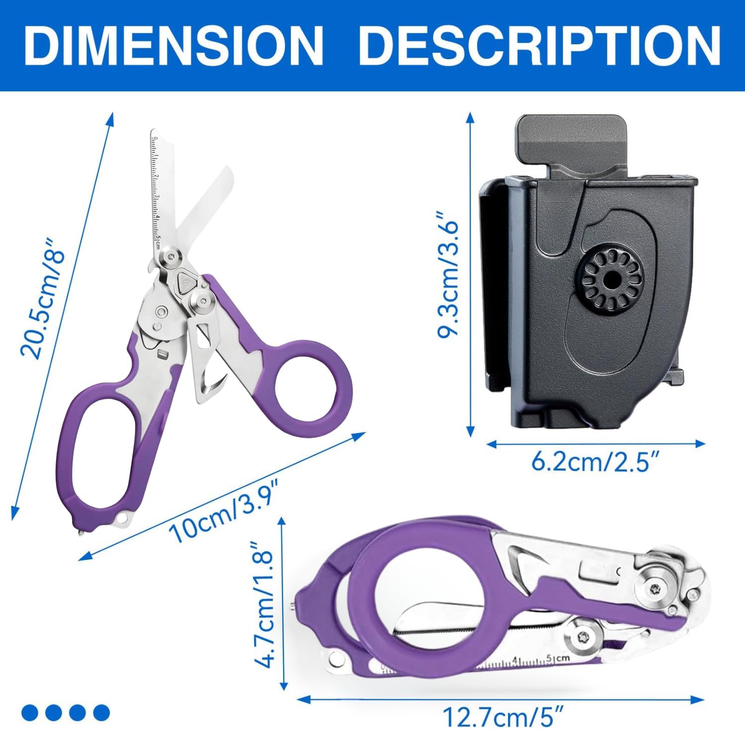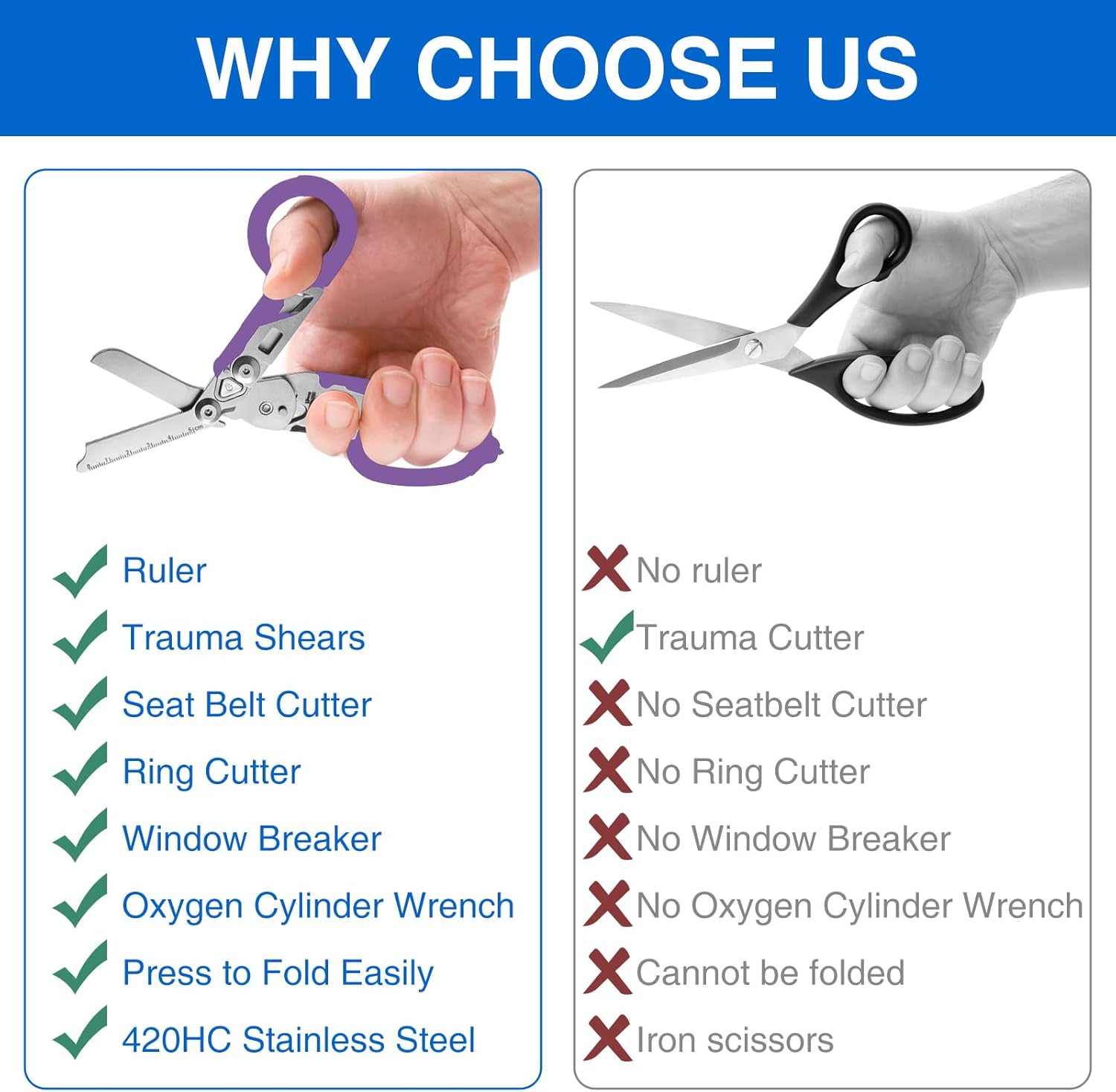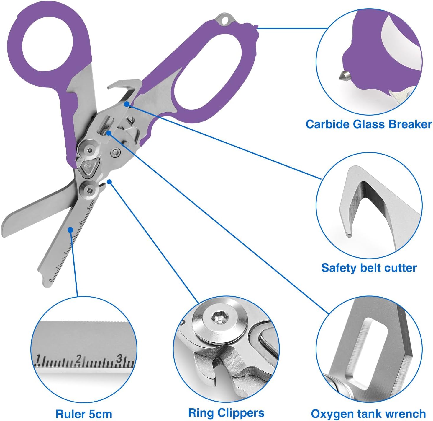 Multi function Trauma Shears :- Foldable trauma shears have 6 basic functions which can be used as trauma shears, belt shears, ring shears, rulers, oxygen tank wrenches and carbonized glass breakers respectively