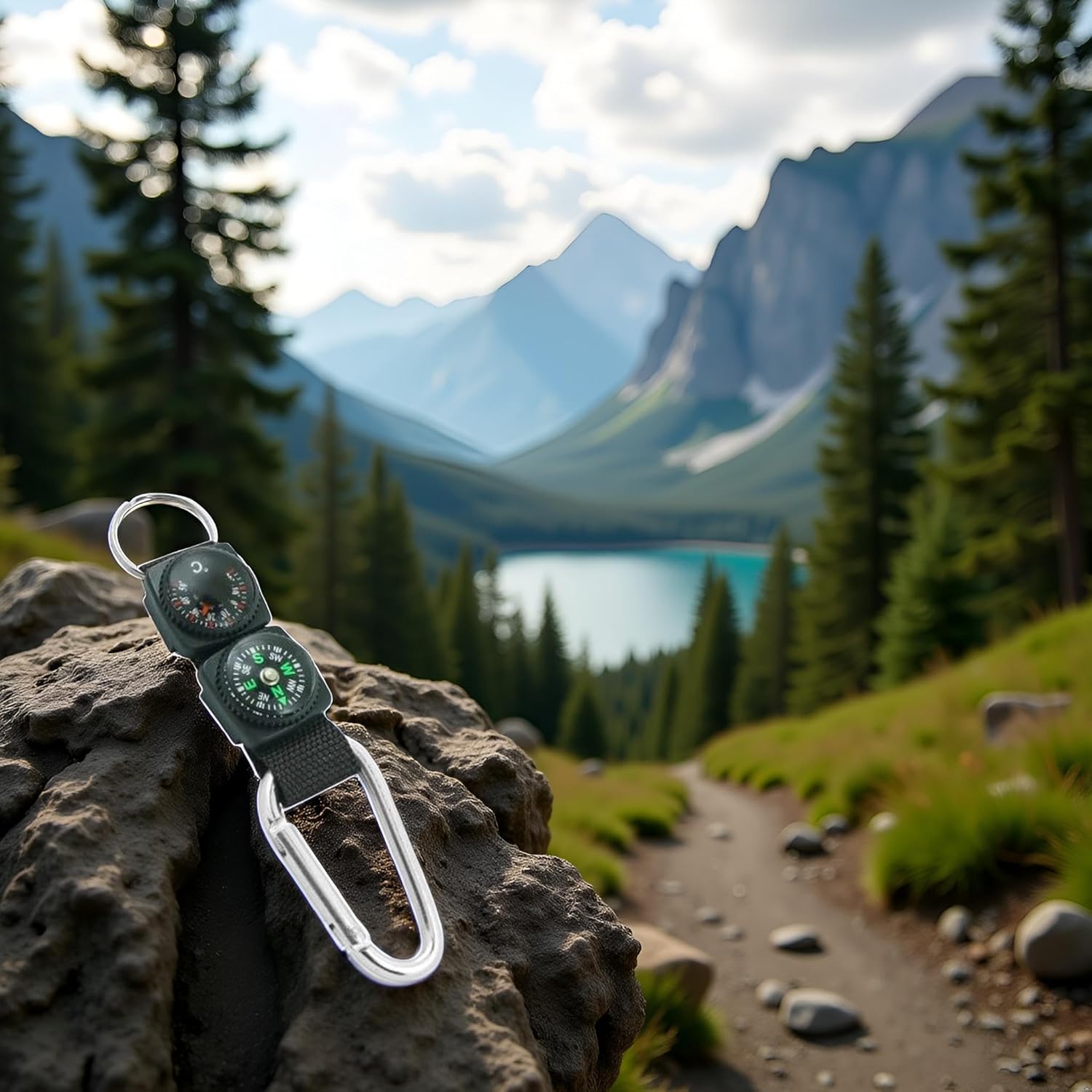 Discover the versatility of our multifunctional outdoor gadget. This compact tool combines a sturdy carabiner clip, reliable compass, and accurate thermometer in one sleek design.