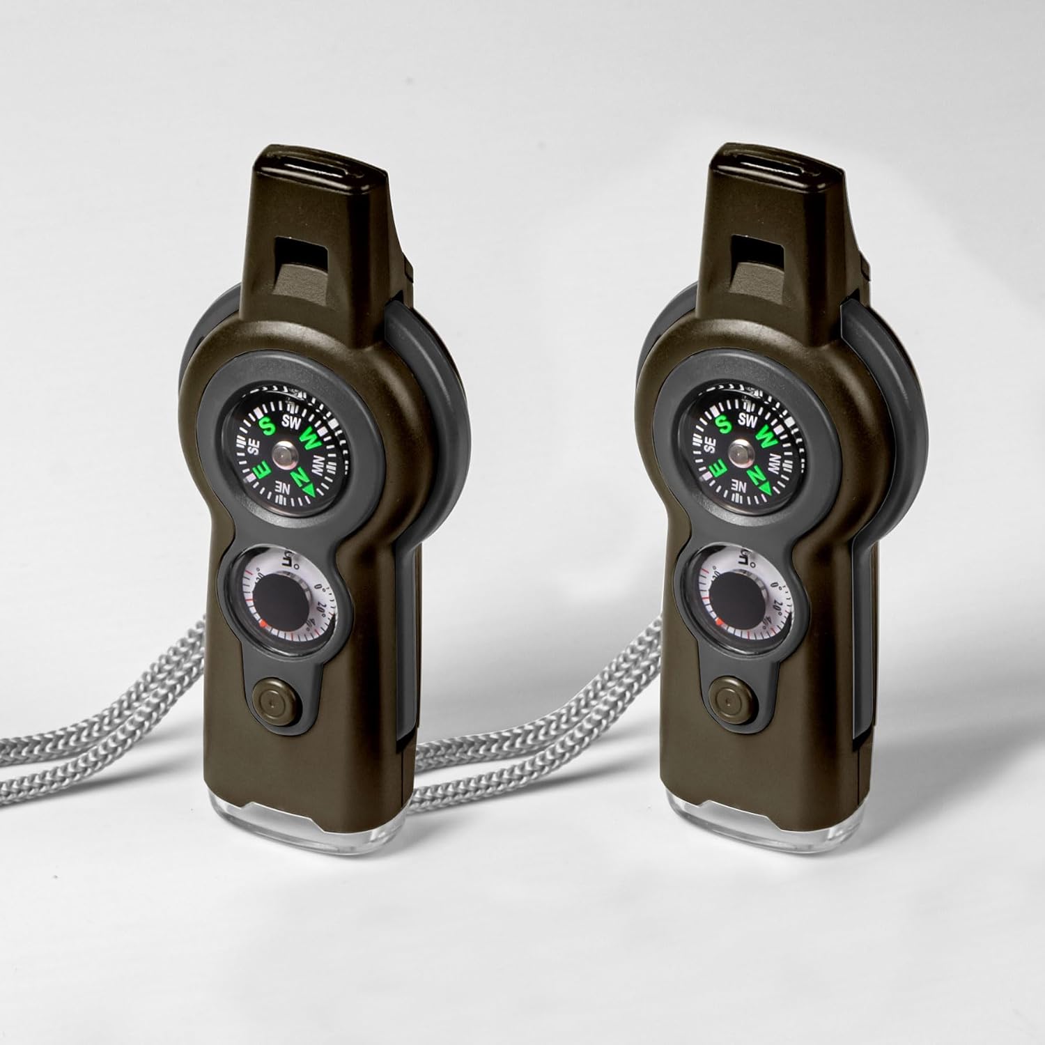 The 7-in-1 Safety Whistle sets 7 functions including Emergency Whistle, Compass, Thermometer, LED Signal Light, Magnifying Glass, Reflector and Sealed Warehouse with good playability (The uniquely designed miniature built-in storage bin can be used to store important personal information, allowing rescuers to grasp your situation at the first time) (NOTE: If you need help in an emergency, you can try whistling softly, which is louder than whistling at full force)