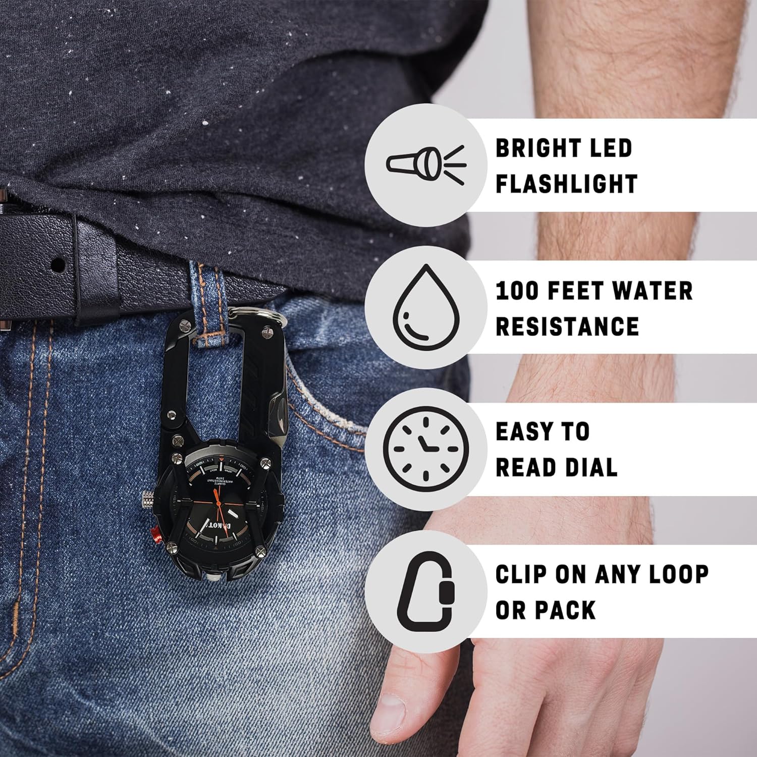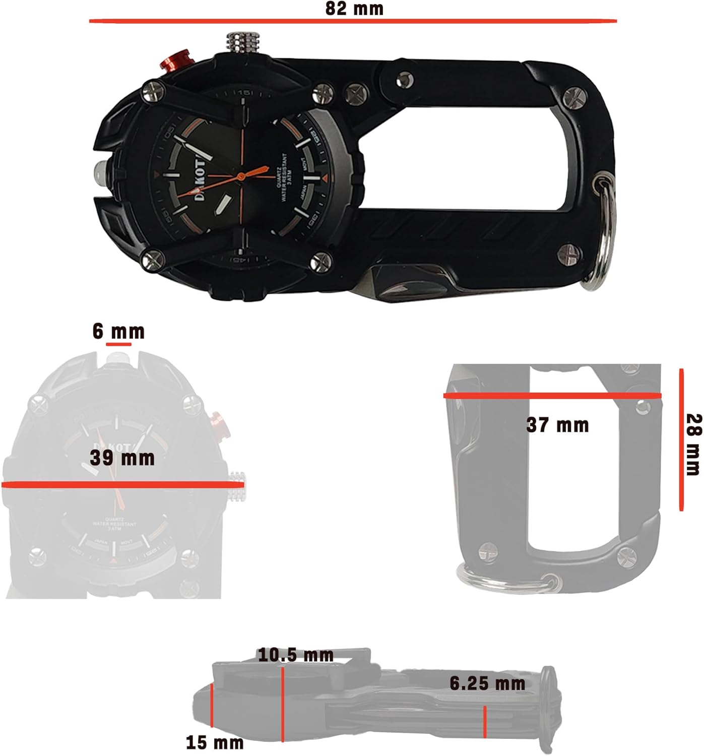 🔧 All-in-One Everyday Tool Watch: Stay ready for anything with a multitool clip watch designed for work and adventure. The black finish gives it a rugged, tactical look while offering practical functionality. Features a built-in flathead screwdriver, bottle opener, and carabiner clip — giving you quick access to essential tools wherever you go.