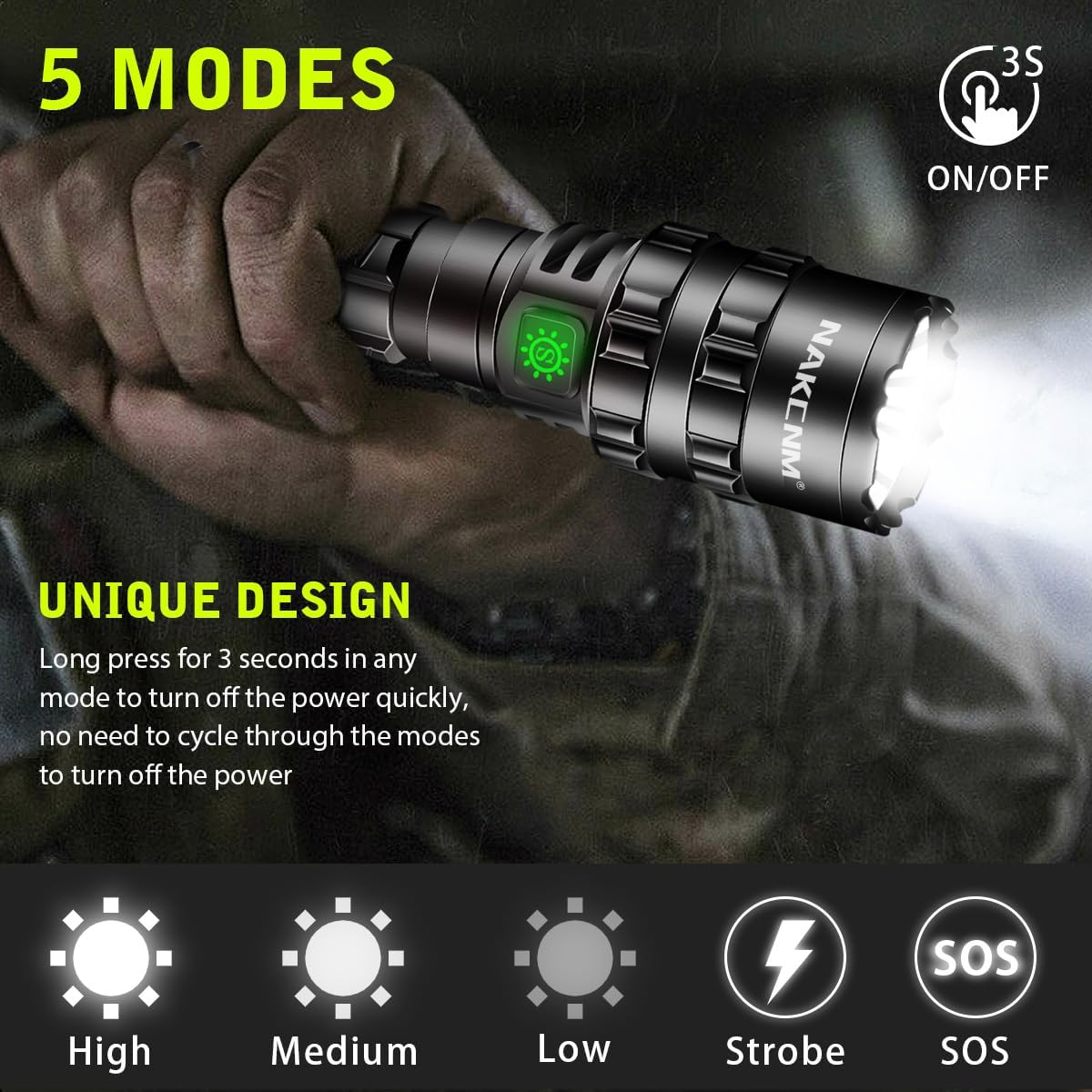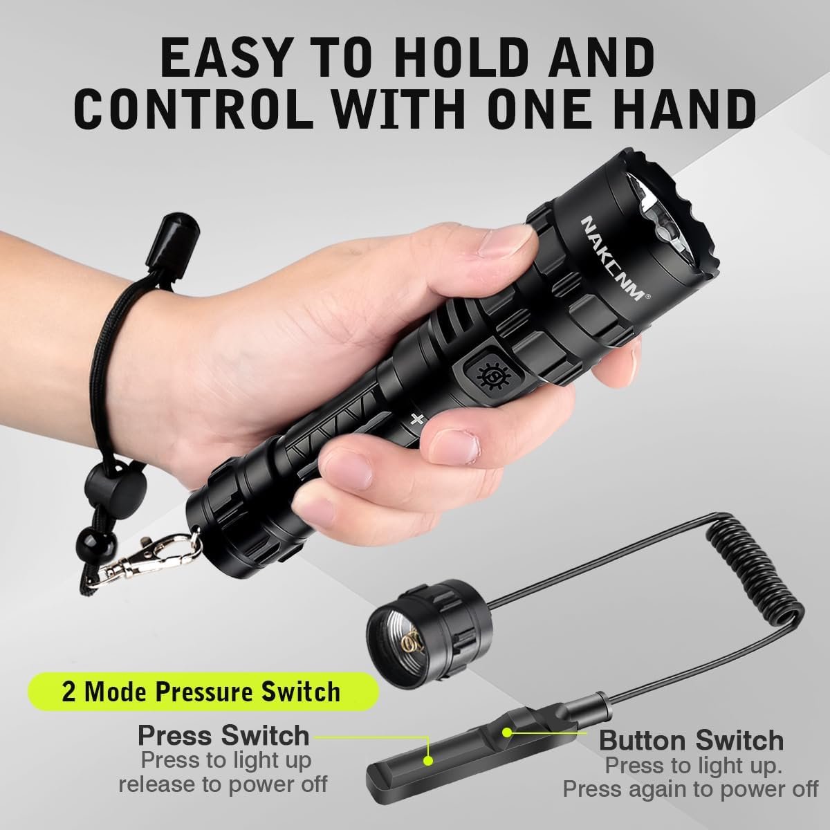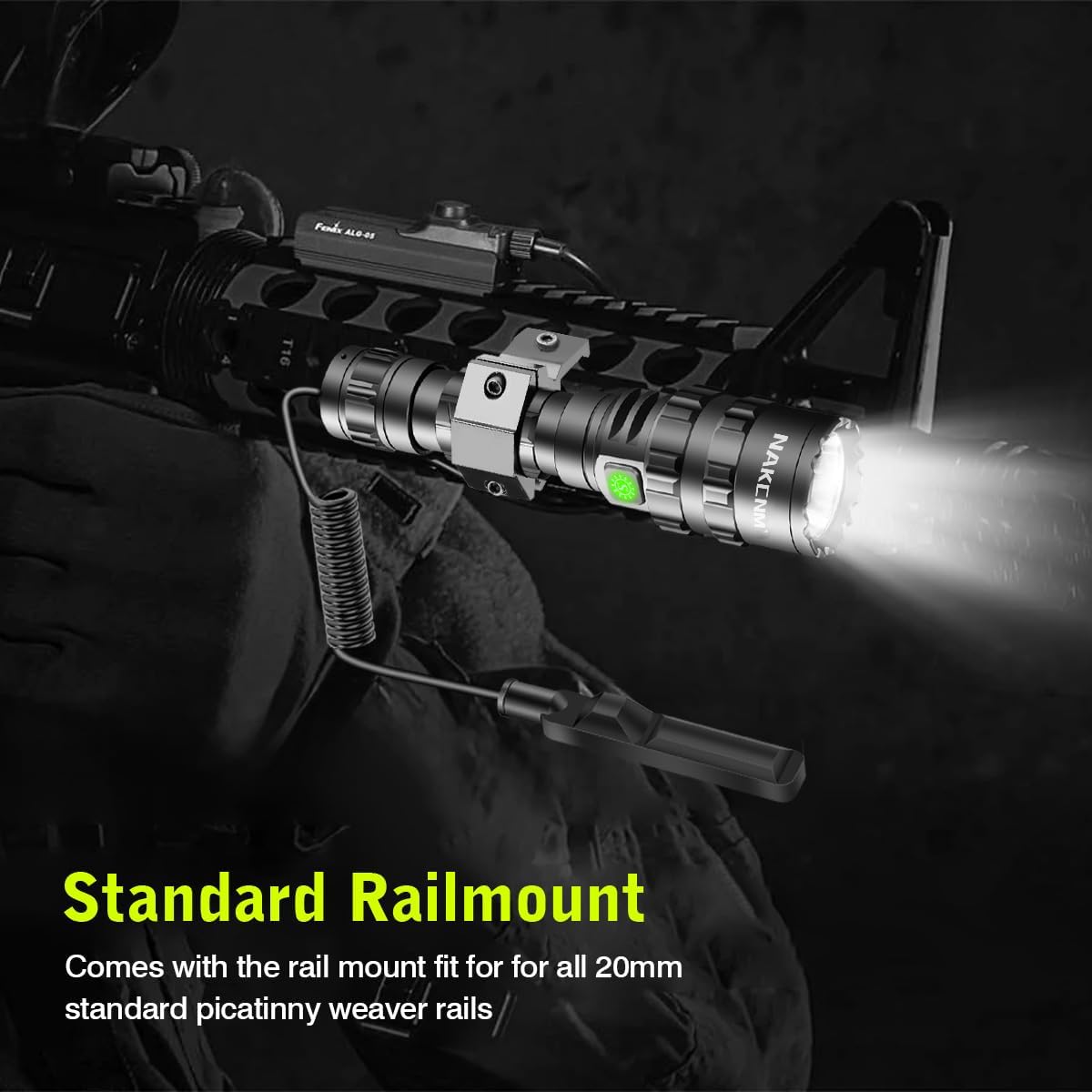 【ADVANCED DUAL SWITCH OPERATION】Unlike other traditional TAC flashlights, NAKCNM new picatinny flashlight adopts a dual switch design, a constant on button switch and a momentary on pressure switch (2 modes) for different tactical needs. Press the button to switch, easy to control.