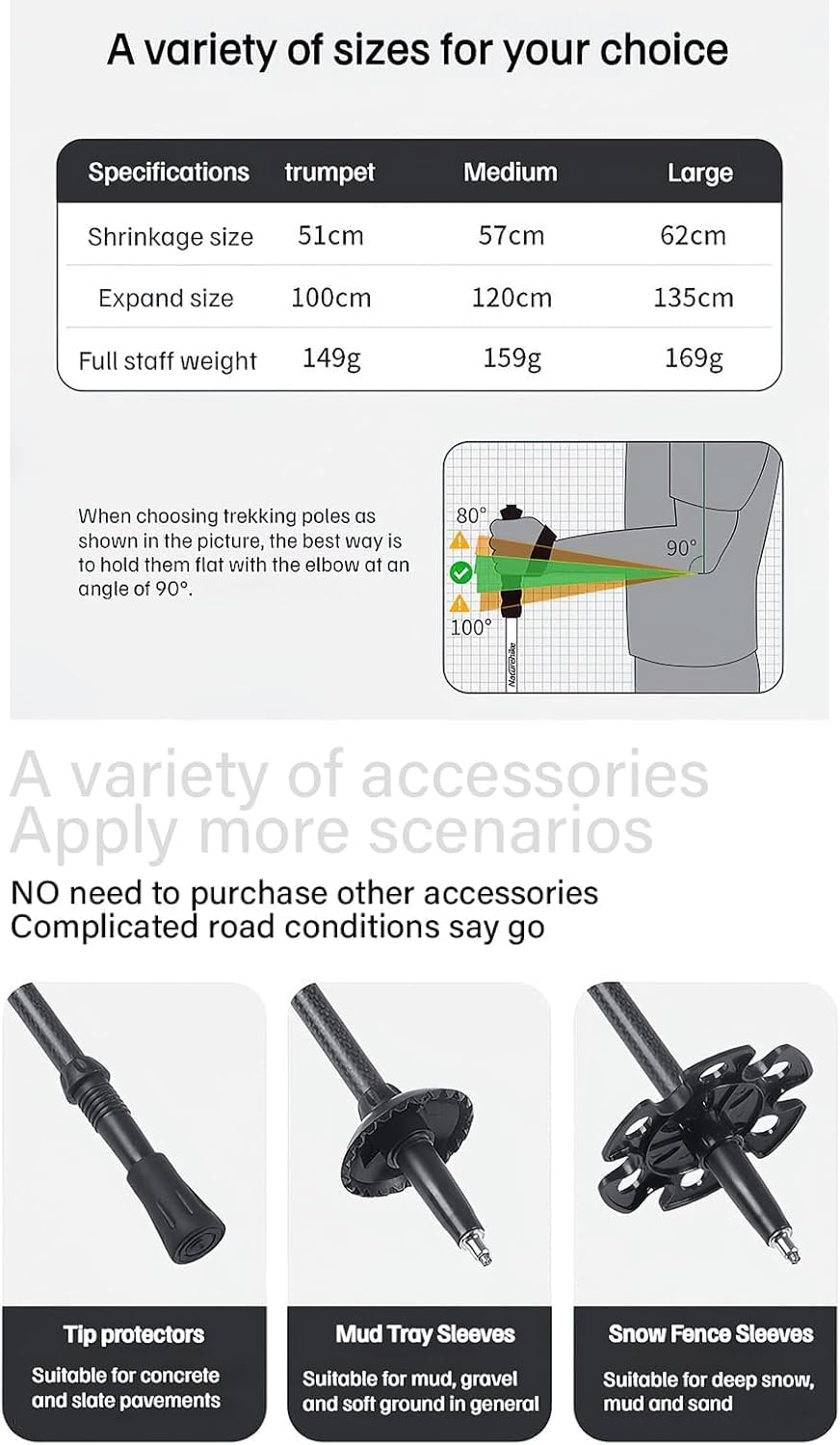 【Hard Tungsten Steel Tip with Excellent Wear Resistance】The hard tungsten steel tip boasts strong wear resistance, maintaining performance even after long-term use, and can be used safely in harsh outdoor environments. It comes with 3 types of accessories, adaptable to various terrains such as cement, gravel, mud, snow and wetlands, ensuring balance and stability on complex surfaces.