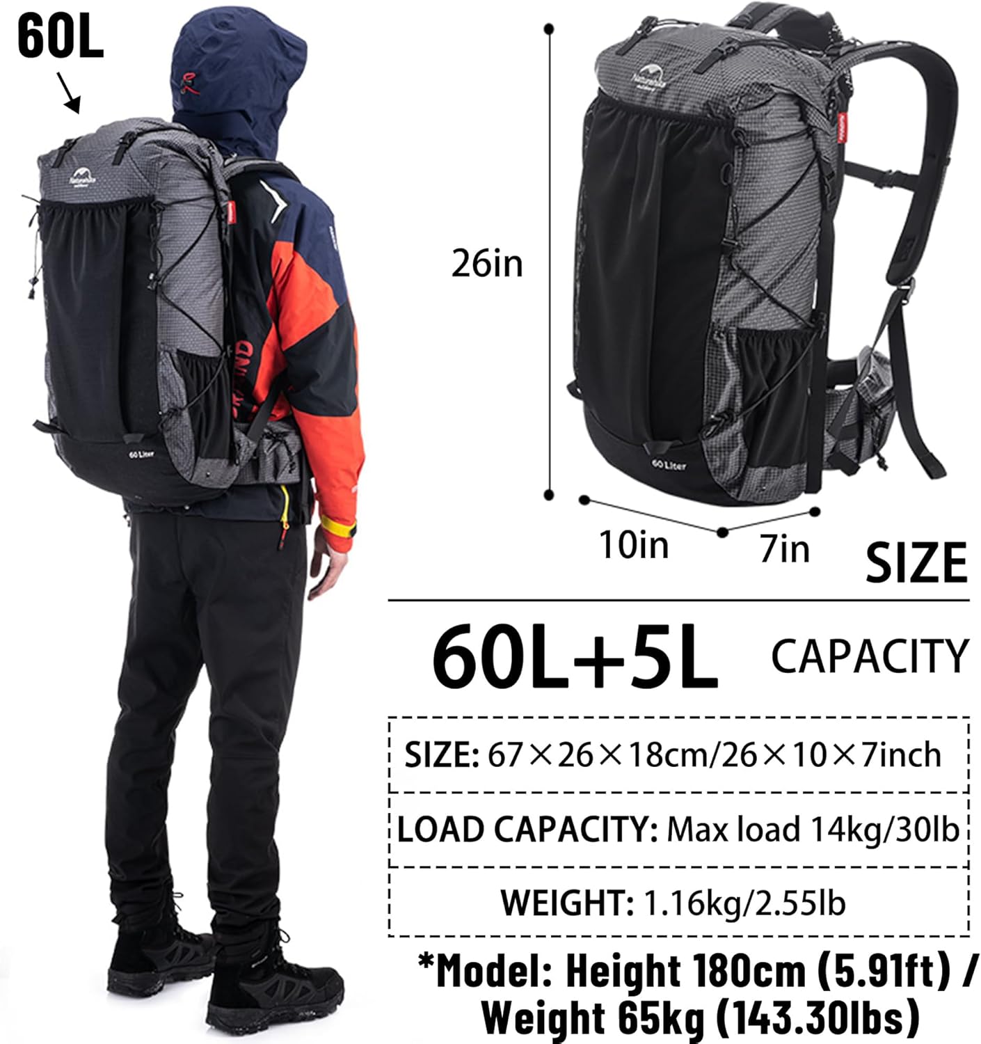 Size of 400L backpack 22”x10”x7”is about and 60L is about 26.37″x10.23″x7.08″. And the Upgraded style backpack are made of wear-resistant high molecular weight polyethylene fiber and 420D nylon mesh cloth, which is durable and waterproof. Ergonomic design, aluminum alloy frame sewn on the inside of the backpack, thickened shoulder straps and strong backpack external hanging capacity. Our hiking backpacks are designed for outdoor traveling enthusiasts.