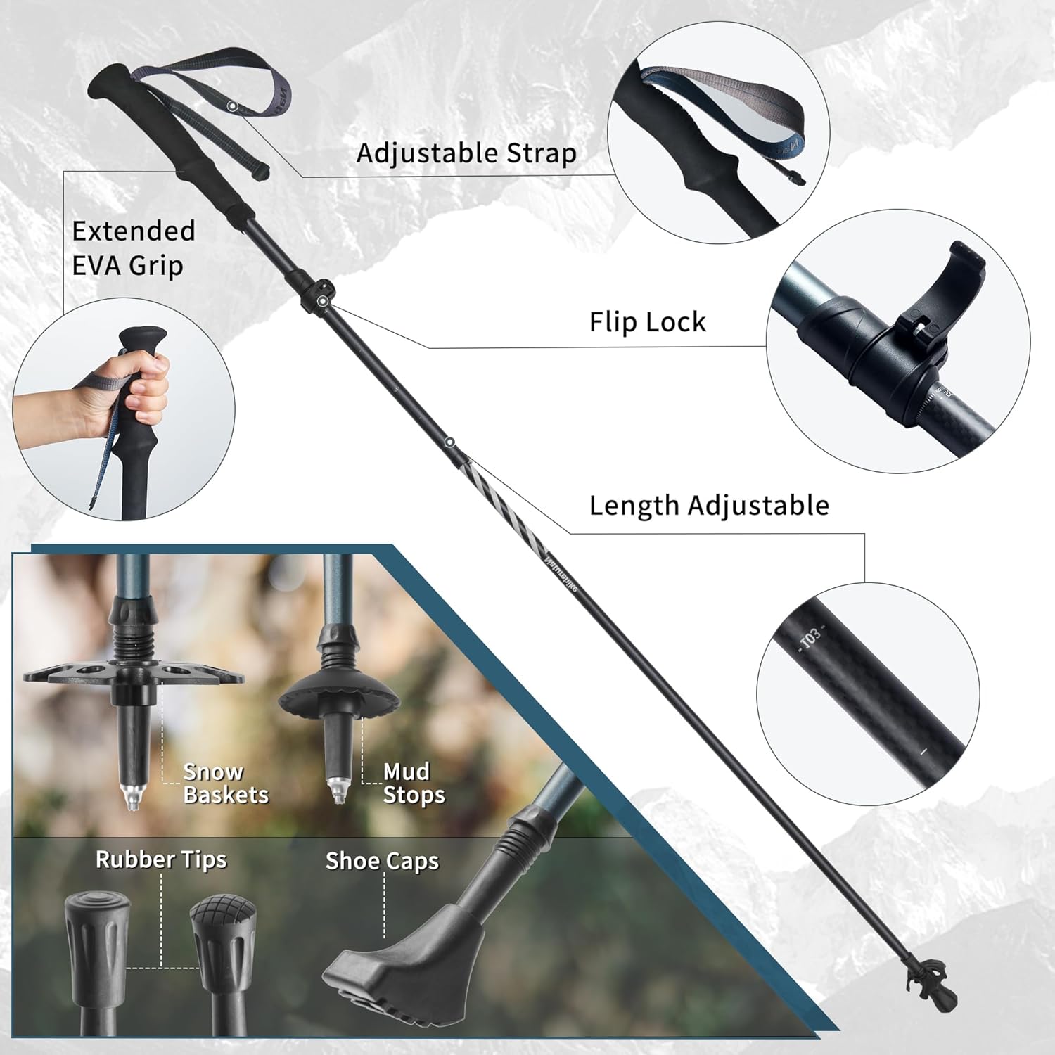 Superior Materials – Our trekking poles utilize only the finest materials, including solid flip locks, reinforced joints, and EVA foam grips with EVA foam extensions. Built to withstand even the toughest conditions, these folding hiking sticks are designed to last through countless adventures.