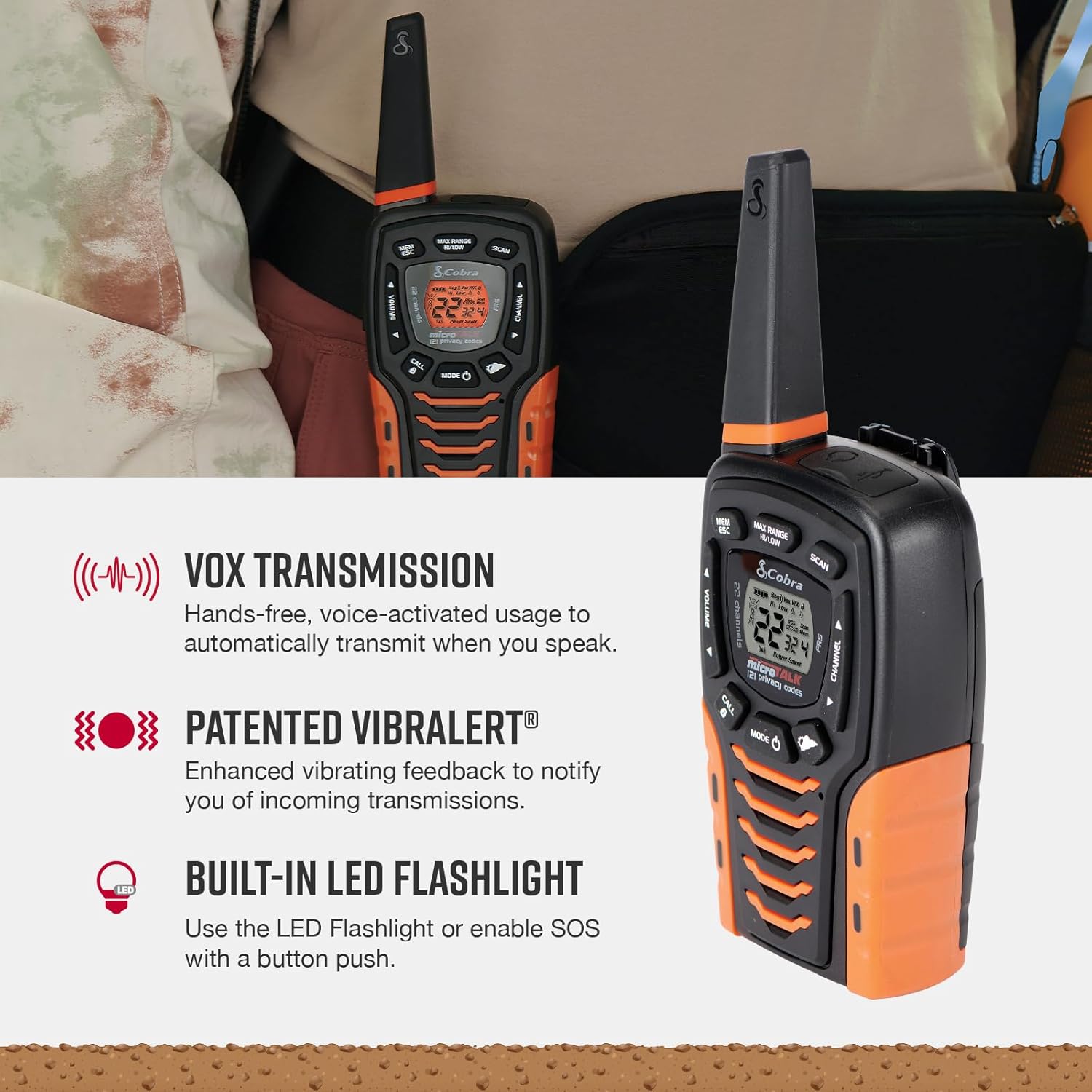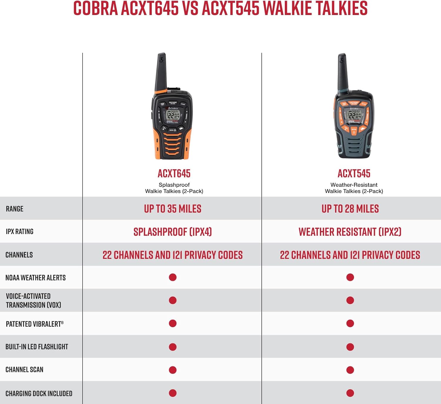 The Cobra ACXT645 is engineered for demanding outdoor conditions. With up to 35-mile range, Waterproof (IPX4) Rating, built-in LED flashlight, NOAA Weather Alerts, VibrAlert® feedback for incoming transmissions, and more, the ACXT645 is perfect for all of your rugged outdoor adventures as well as for emergency preparedness.