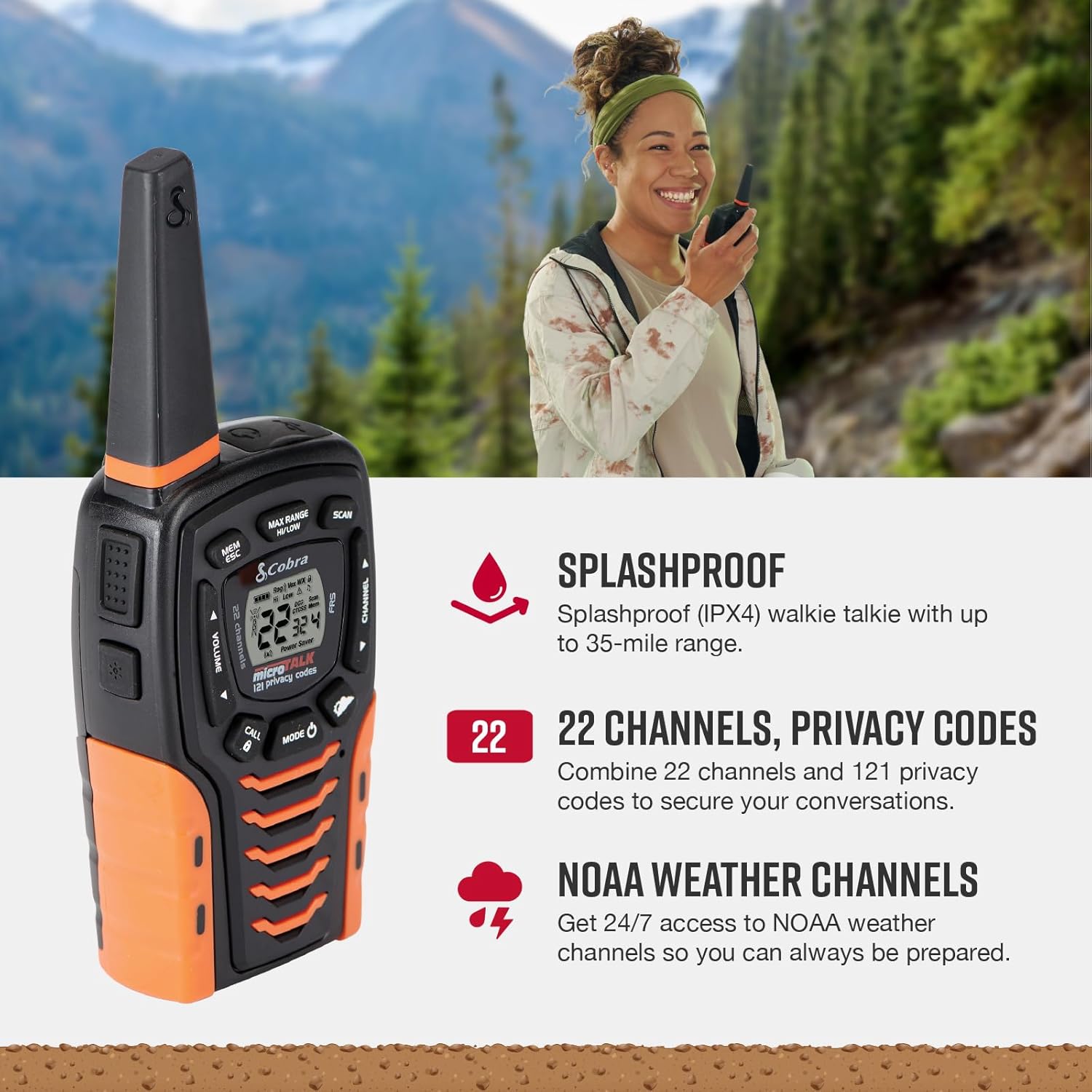 RUGGED AND SPLASHPROOF – Splashproof (IPX4) walkie talkie with up to 35-mile range. Built with a strong shell and drop-proof design so your radio can withstand harsh conditions. The waterproof design allows clear communication in rain or shine.