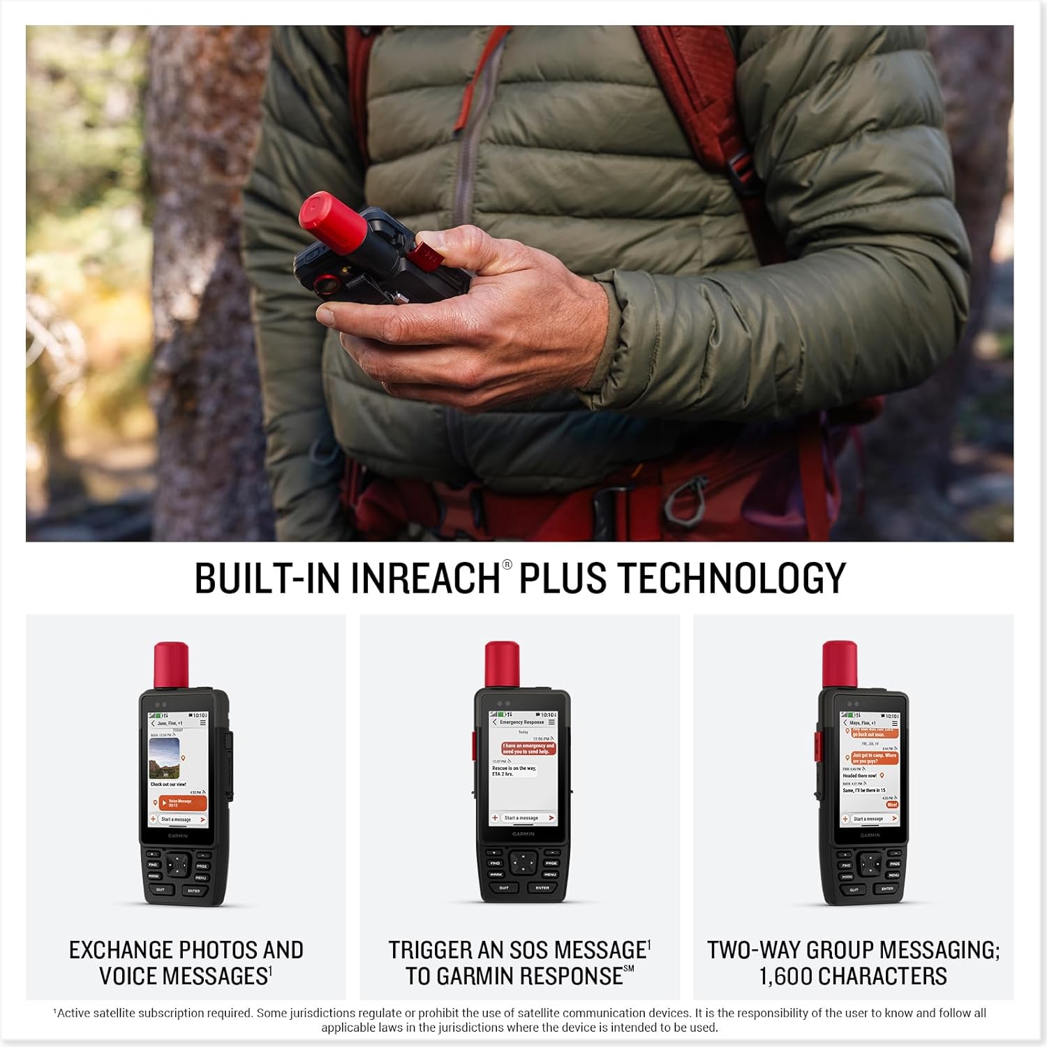 GPSMAP H1i Plus navigator with built-in inReach Plus technology helps you stay in touch when you venture beyond cell service; with an active inReach satellite subscription, you can exchange texts or use the built-in camera/mic to snap and share photos and voice messages (some jurisdictions regulate or prohibit the use of satellite communication devices)