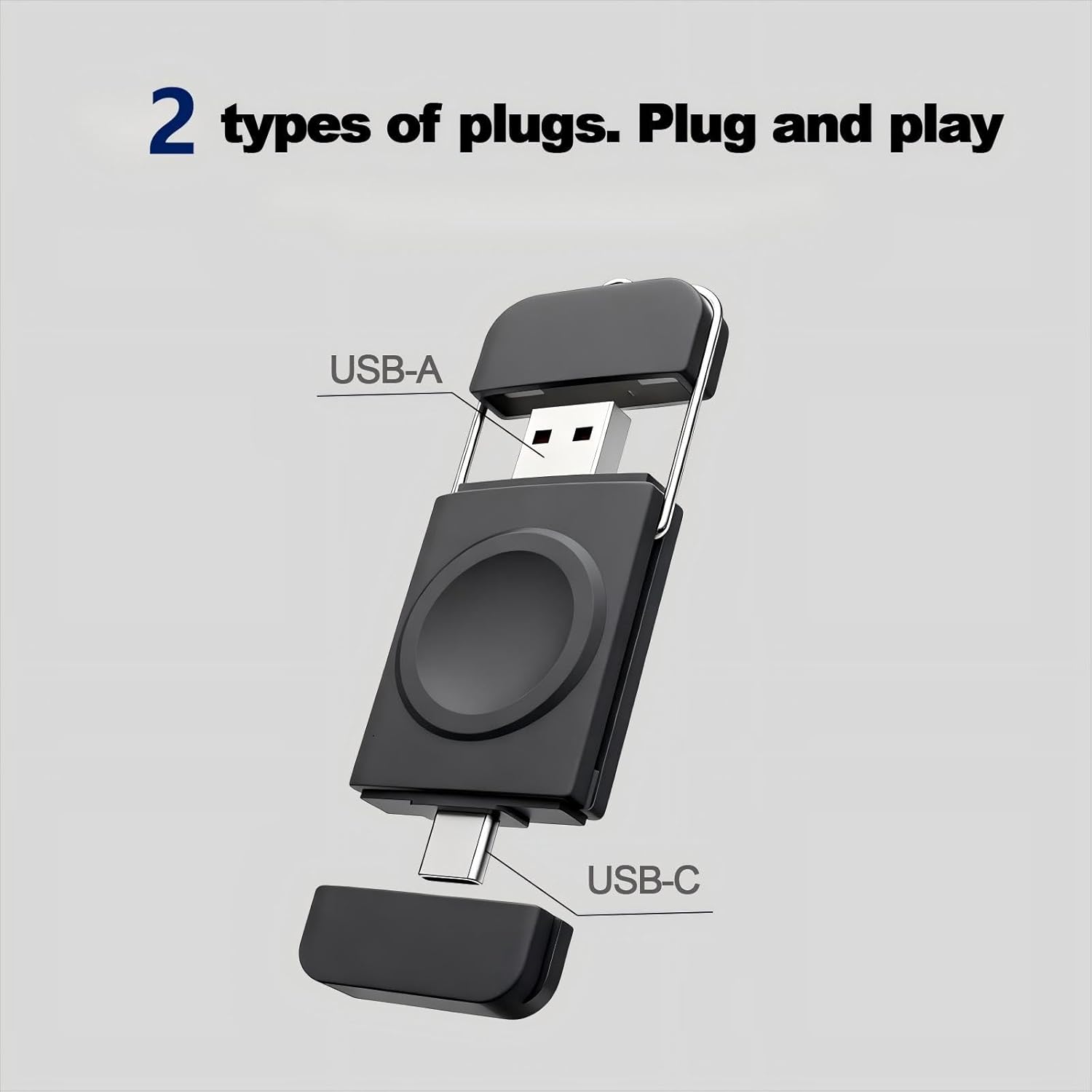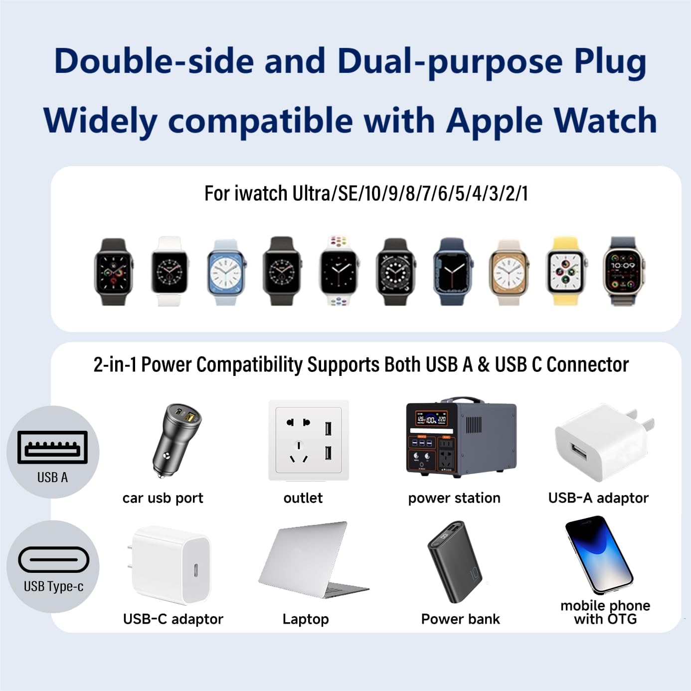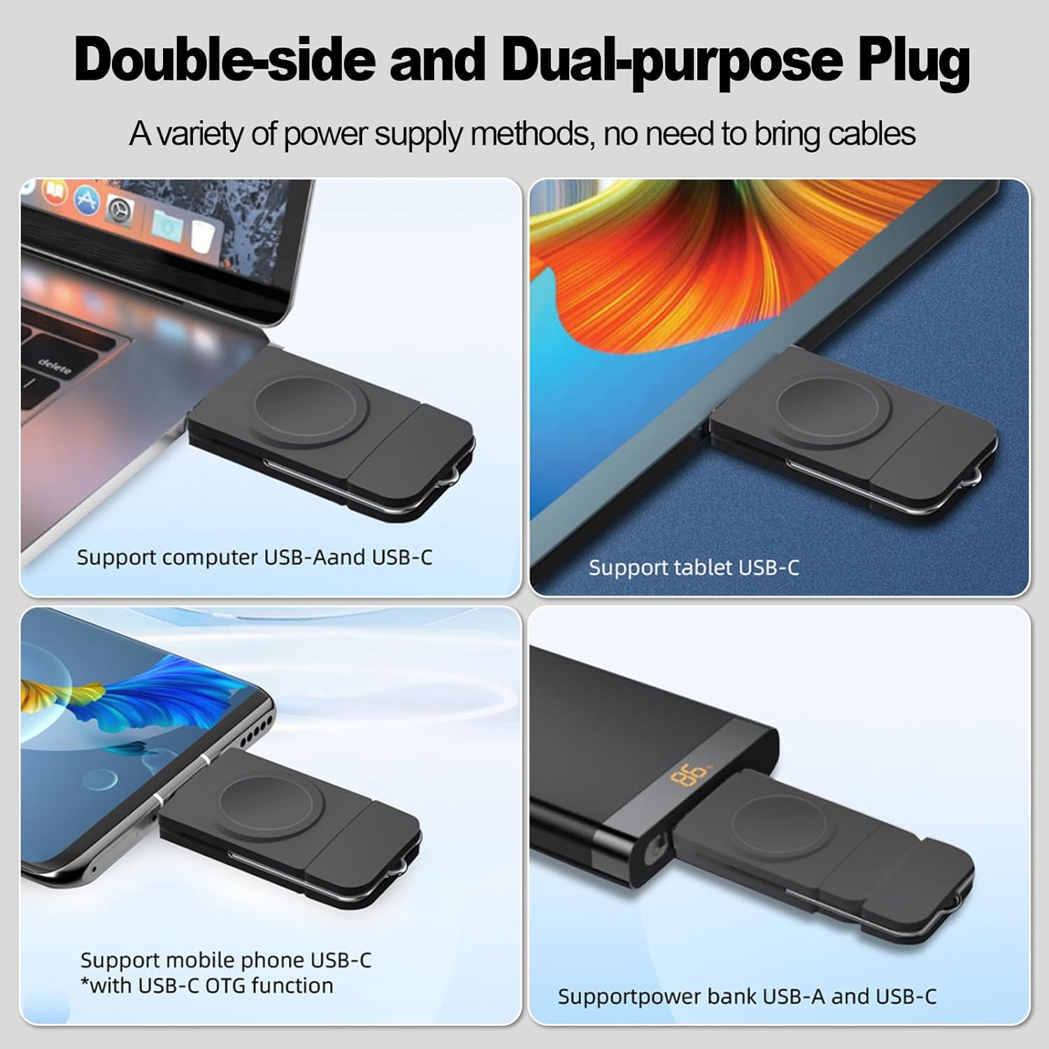 【Innovative designed & USB A/C Cordless Charger】:Built-in USB-A & Type-C plug.No additional cable needed.Cordless charger supports adapter,computer,tablet and mobile phone with OTG function input.Strong magnetic attraction.When your iwatch close by.The magnetic charger automatic alignment and charge immediately.