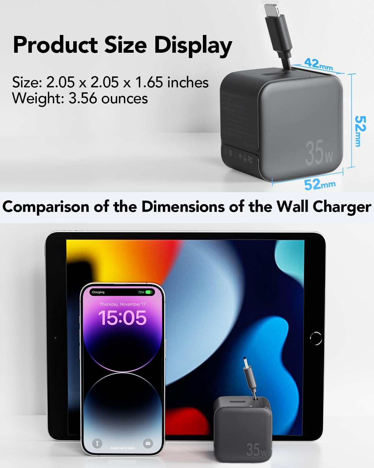 [35W PD Fast 2 in 1 Wall Charger for Two Devices] The retractable phone charger with a retractable lightening cable and USB-A port, can power up 2 devices simultaneously at high speed. When charging only one device:PD Cable is 35W or USB-A Port is 18W. When charging 2 devices simultaneously:20W for retractable Cable+15W for USB-A Port